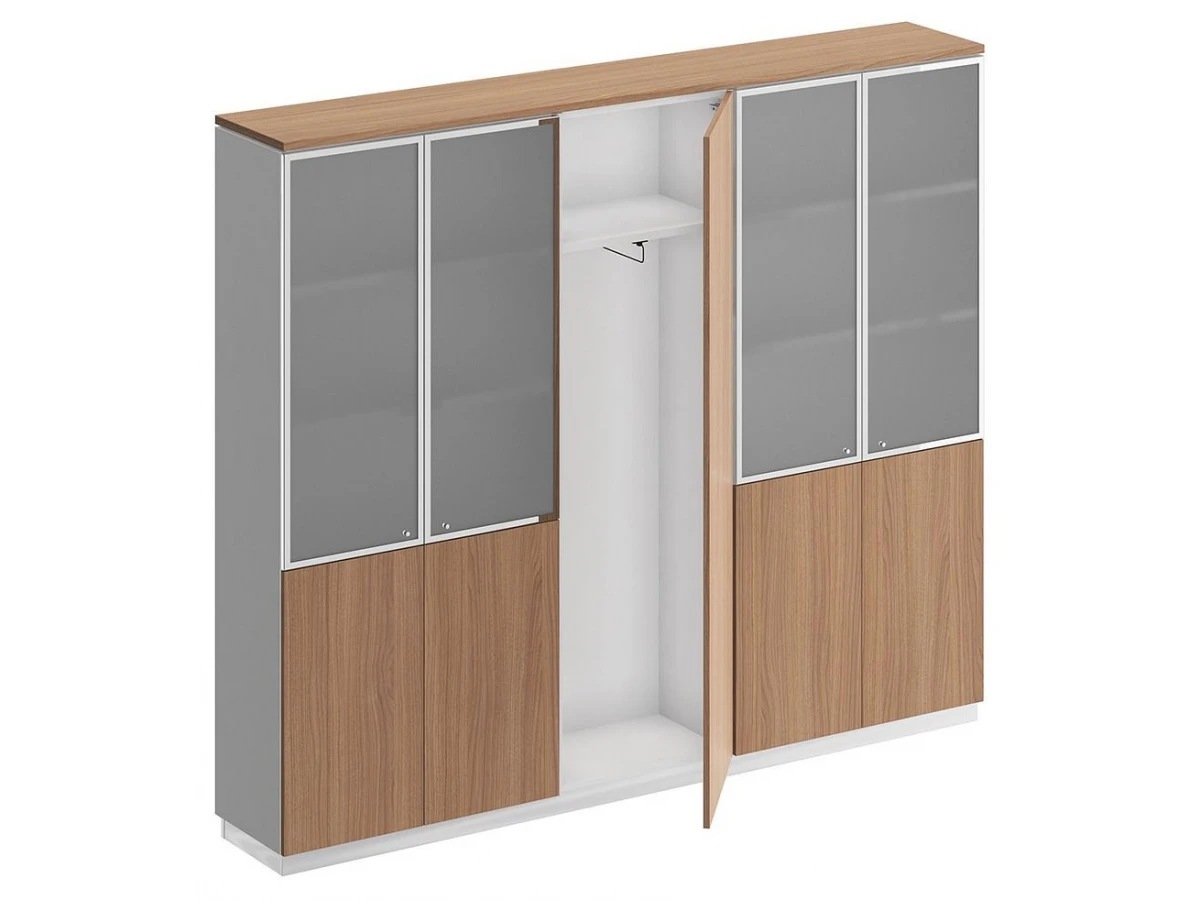 Шкаф состоит из 2-х стеллажей с полками и шкафа для одежды с полками, топа, цоколя и дверей.