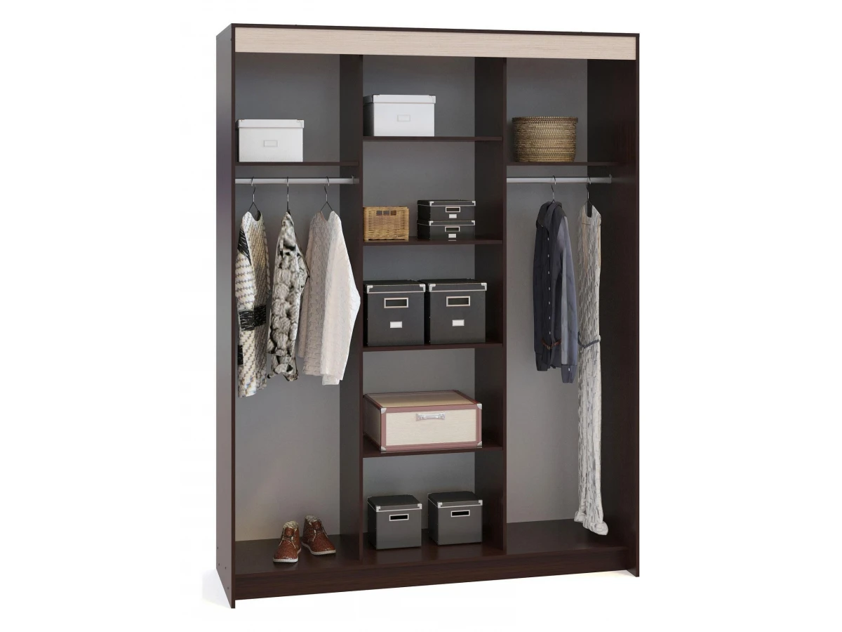 Для размещения вещей в шкафу предусмотрены два отсека со штангами по бокам и отделение с четырьмя полками по центру. Большое внутреннее пространство подойдет для хранения габаритных предметов, например, коробок с обувью или чемодана.