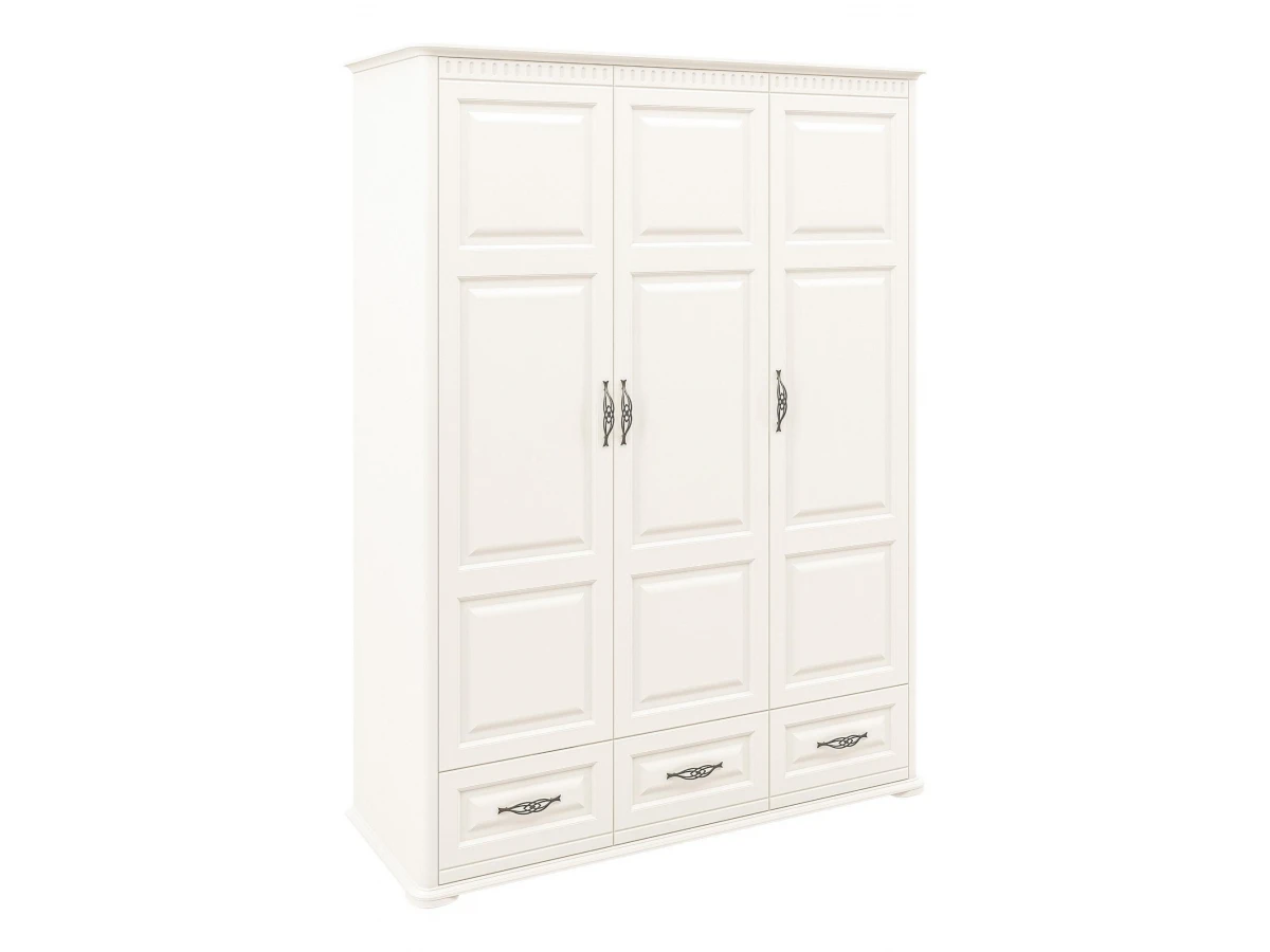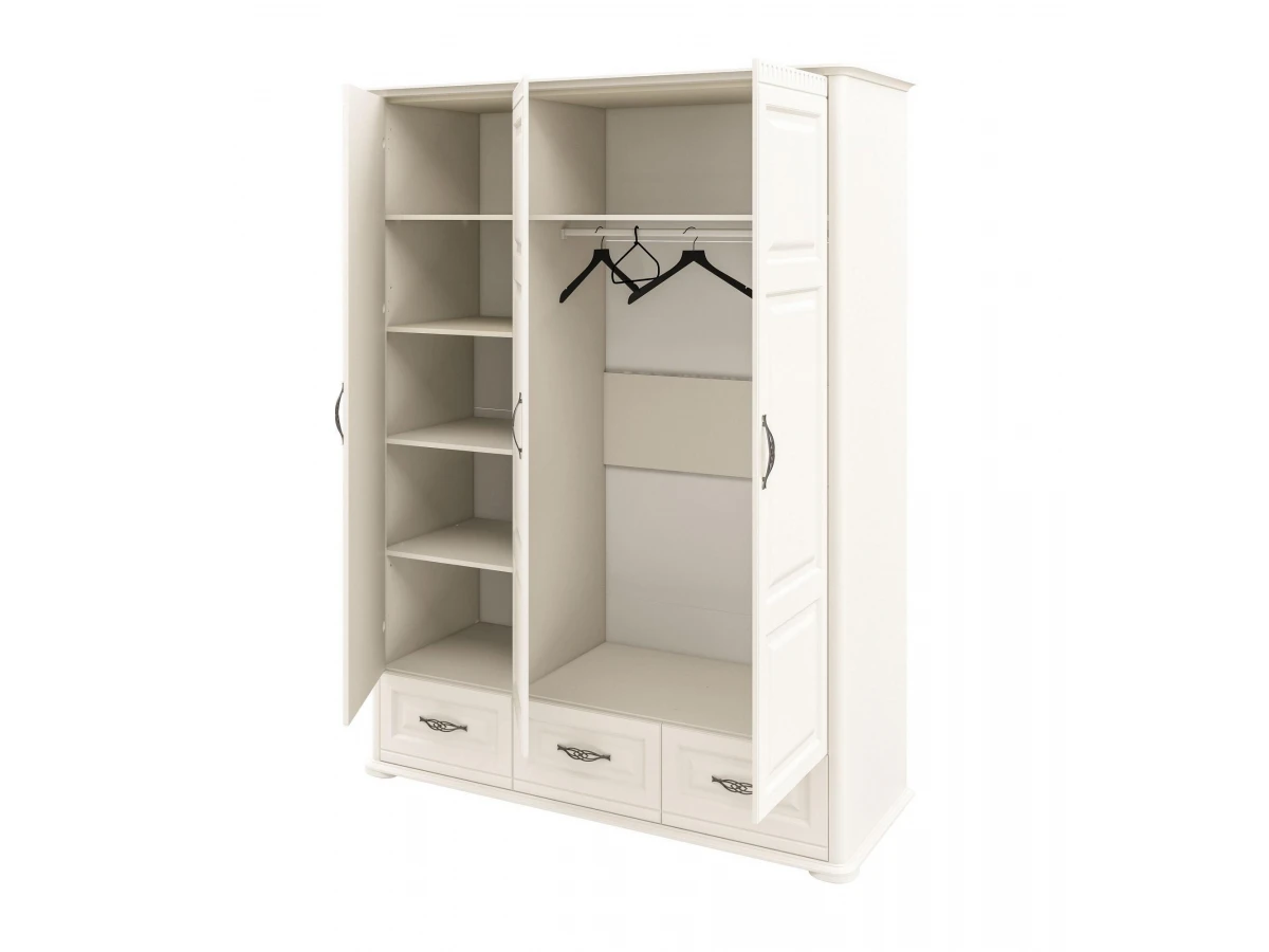 Ищете надежную и красивую мебель для своего интерьера? Шкаф платяной Марсель МН-126-03_1 из серии «Марсель» – то, что вам нужно. в следующей комплектации: 1 штанга для вешало, 3 дверцы, 3 ящика, 5 полок. ЛДСП Е1, из которого выполнен фасад, имеет прочное верхнее покрытие (цвет «крем»), подходящее для размещения в помещениях с повышенной проходимостью, а компактные габариты изделия позволят выигрышно использовать полезное пространство (шкаф шириной 1650 мм и глубиной 630 мм, при этом вы сможете разложить в нем все необходимое благодаря внушительной высоте, равной 2200 мм).