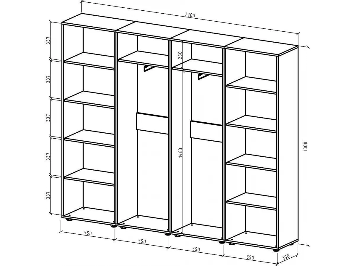 2 штанги для вешалок,4 дверцы, 10 полок