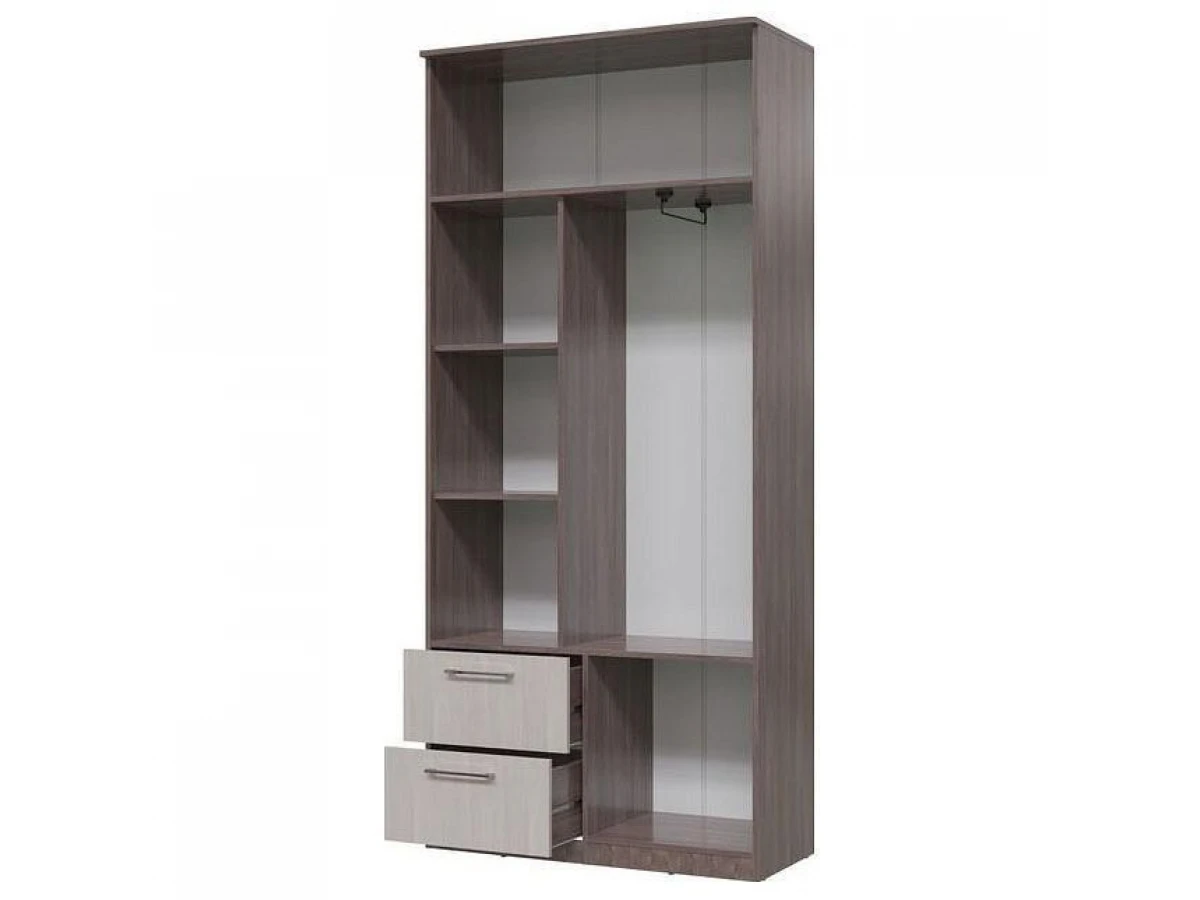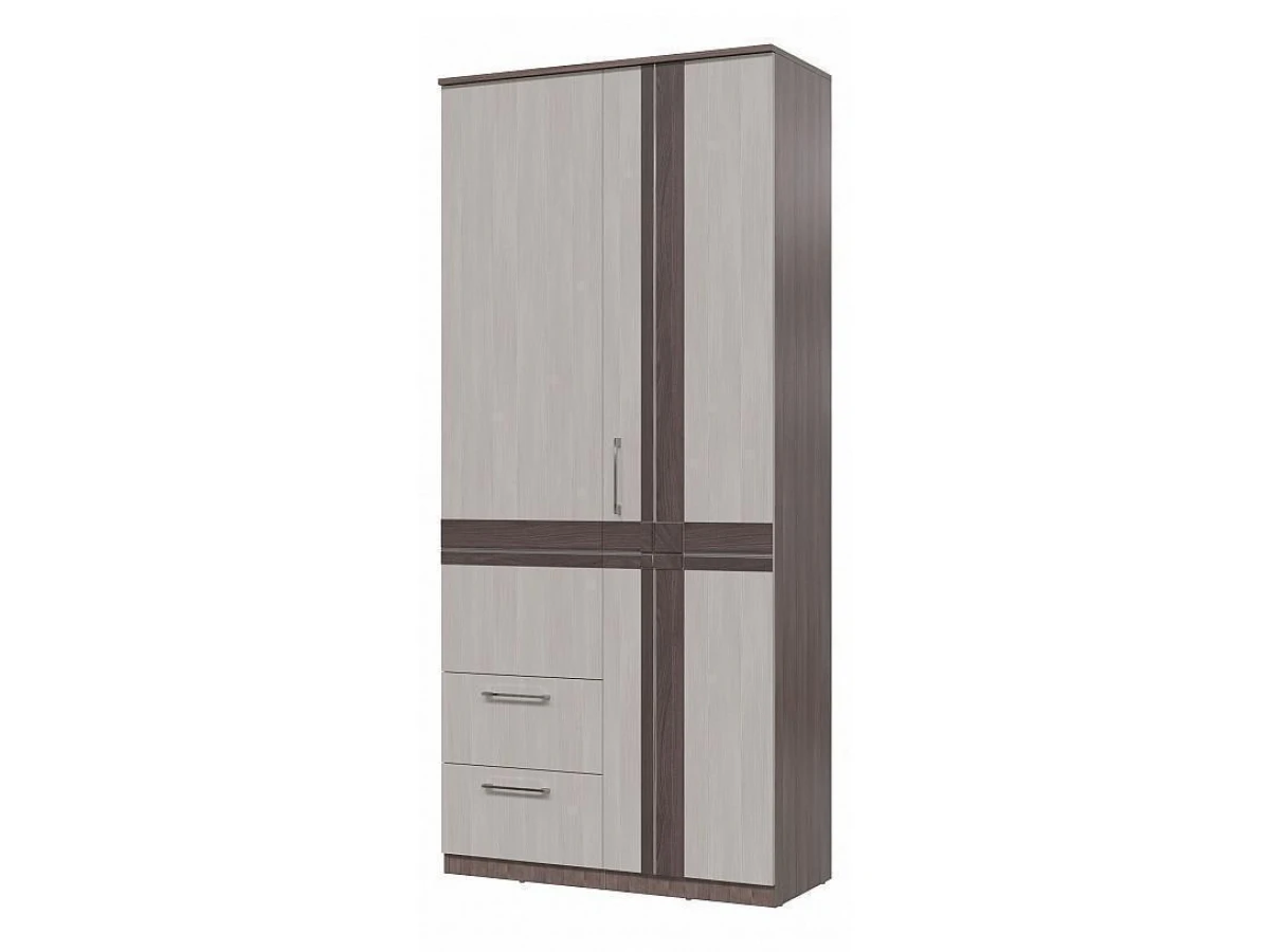 Современный двухдверный шкаф из модульной спальни Презент. Внутри шкафа располагаются: антресольная полка, отделение с выдвижной штангой, два выдвижных ящика и отделение с полками.