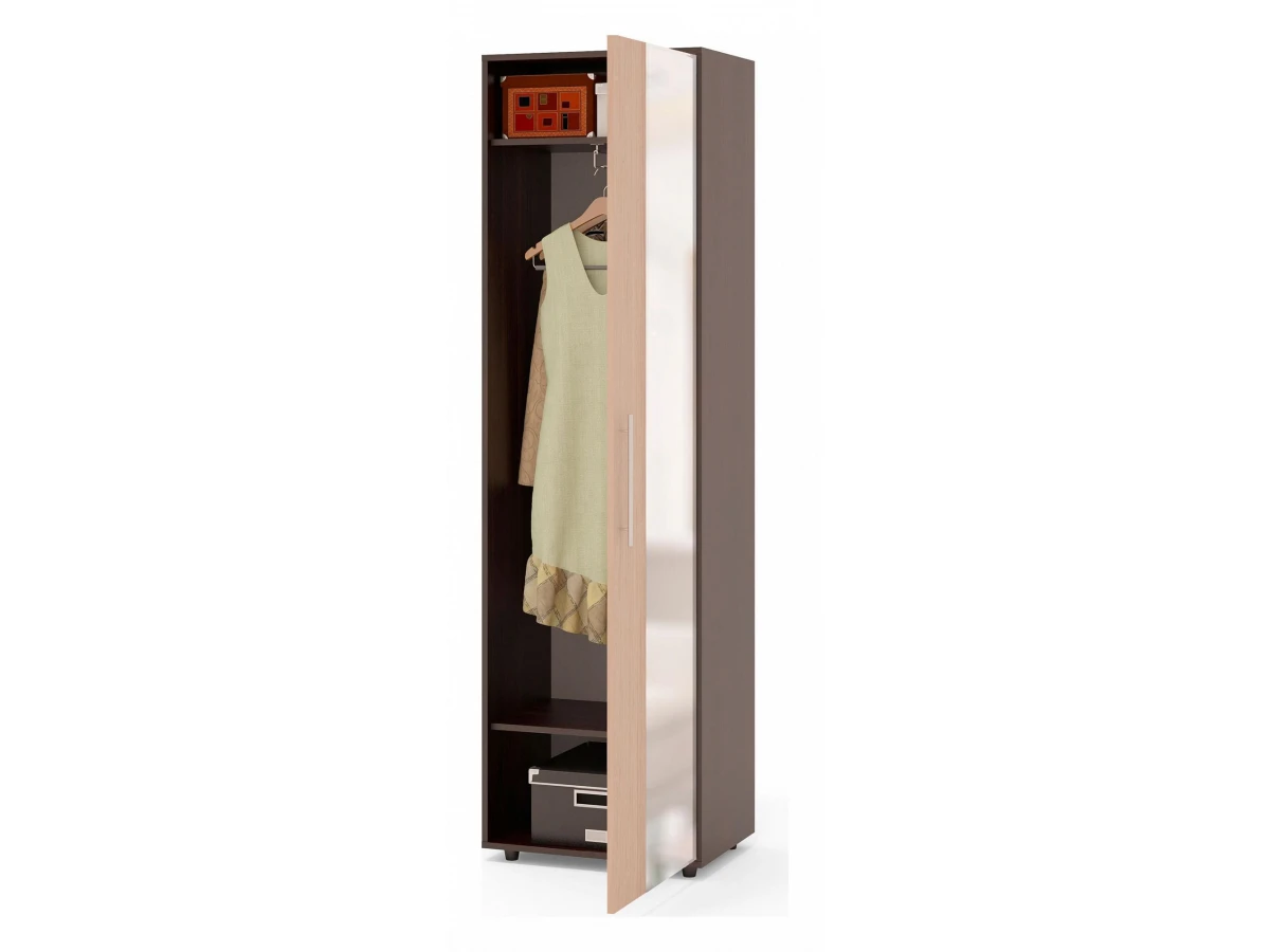 Шкаф платяной шириной 600 мм. оборудован выдвижной штангой и зеркалом. Зеркало визуально расширит пространство и просто незаменимо в прихожей. Изделие изготовлено из ЛДСП.