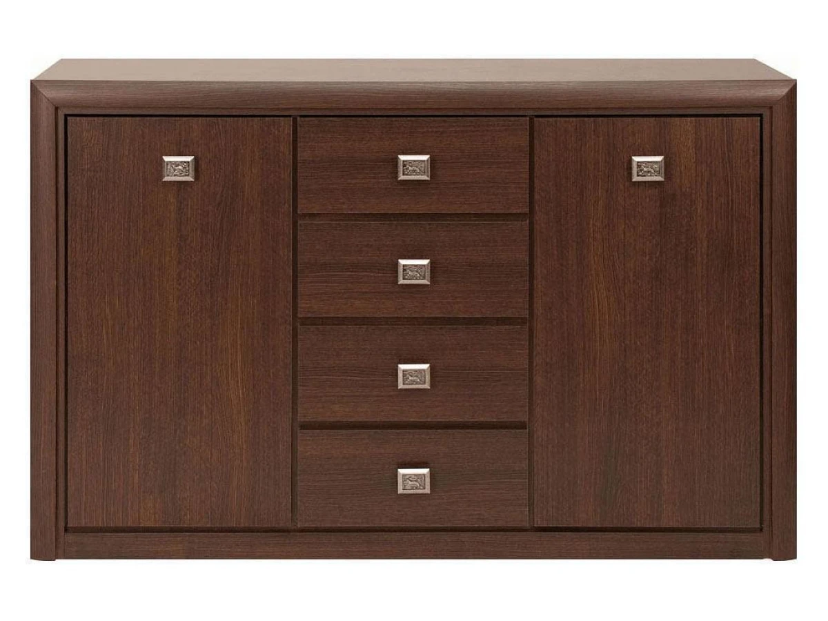 Классический комод Коен с четырьмя выдвижными ящиками по центру и двумя дверцами по бокам, прекрасно вместит в себя все нужные вещи, при этом не займёт много места.