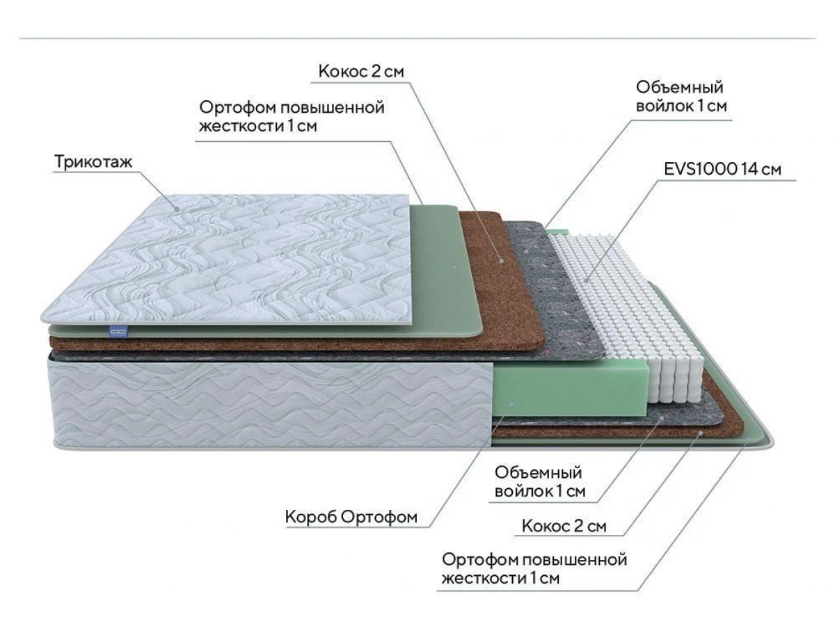 Блок независимых пружин — современная несущая система матрасов, обеспечивающая анатомическую поддержку тела спящего. Независимые пружины, изолированные друг от друга, чутко реагируют на нагрузку в каждой точке матраса Green Extra F, создавая точную поддержку позвоночника.