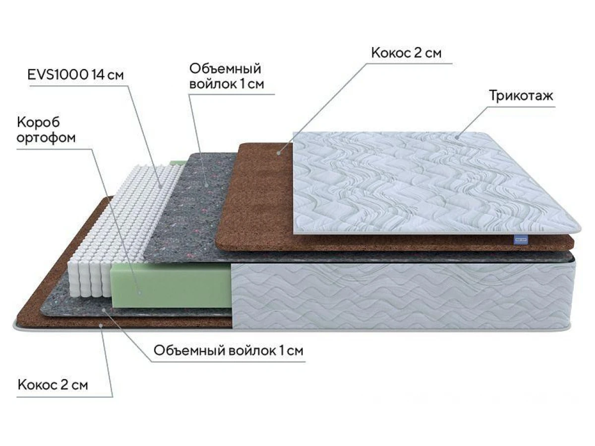 Матрас ProSon Green F содержит прослойку из кокосовой койры. Кокос — натуральный материал, отлично дышит, придает матрасу жесткость и упругость.