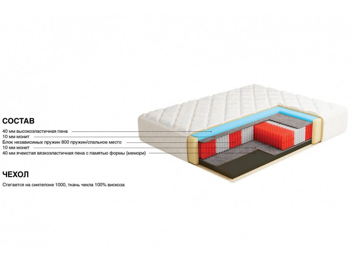 Матрас сочетает в себе внешнюю красоту чехла, который делается из премиальных тканей из 100% вискозы, и высочайший комфорт, который обеспечивают независимый блок пружин и высокотехнологичные ортопедические пены. Благодаря такому количеству пружин матрас может выдержать достаточно высокие нагрузки, а также точнее подстраиваться под форму спящего. На этом матрасе себя будут комфортно чувствовать пары с большей разницей в весе, эффекта «скатывания» не будет.