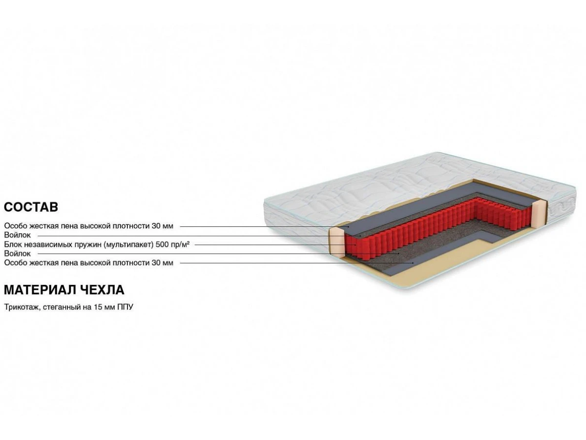 В основе матраса лежит блок независимых пружин (мультипакет) 500 пр/м2, благодаря такой плотности пружин, матрас может повторять контуры спящего с максимальной точностью и при этом выдерживать довольно высокие нагрузки. Термовойлок защищает комфортные слои от истирания и соприкосновения с пружинами. В качестве комфортного слоя используется самая жесткая и прочная пена из существующих - (HL4065) толщиной 3 см.