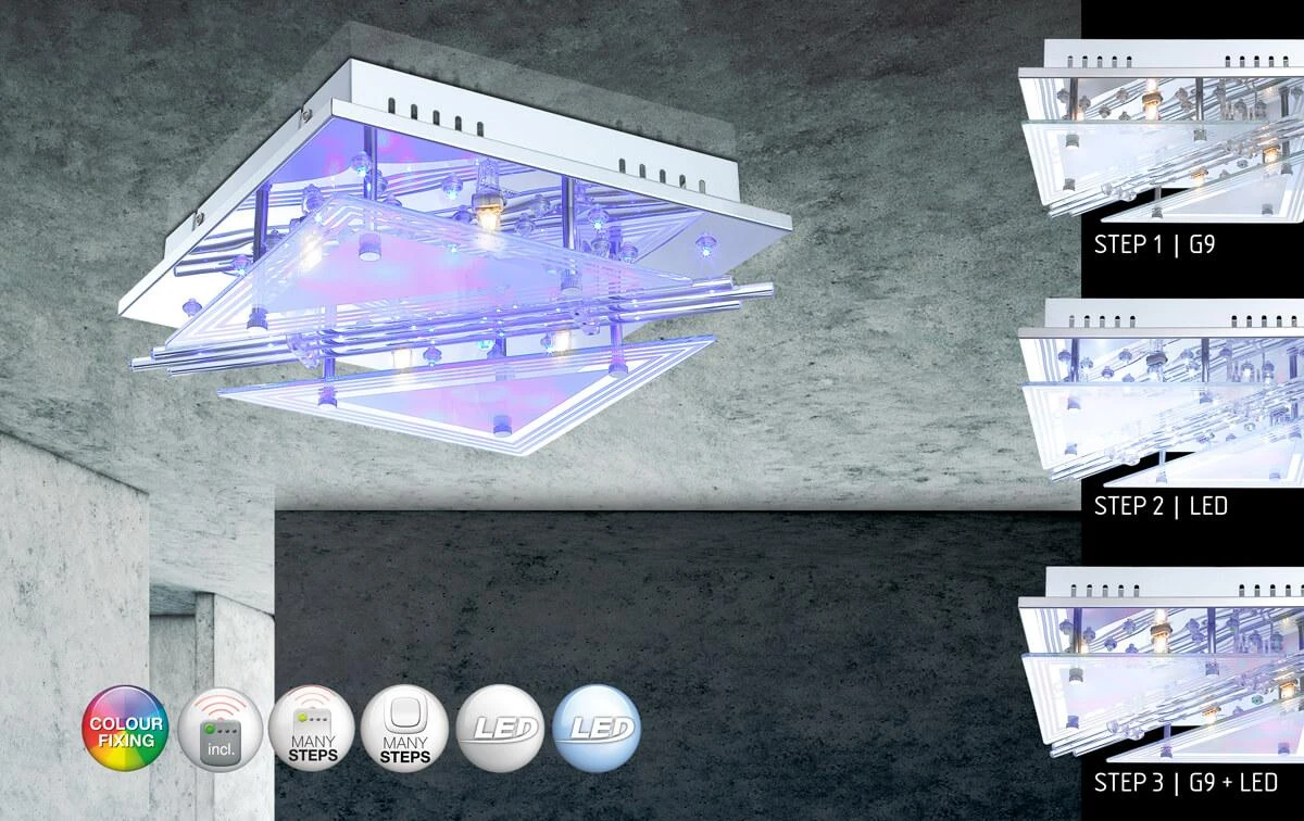 Утонченная модель 68246-4 от австрийской компании Globo относится к коллекции Spinosa и отлично подойдет для установки на потолок спальни, оформленной в современном стиле. Потолочный светильник Globo Spinosa 68246-4 с квадратными плафонами осветит помещение площадью 7 кв. м. Производитель Globo рекомендует использовать для устройства галогеновые лампы с цоколем G9 и мощностью 33 W. Прибор произведен с использованием материалов: пластик и металл и может использоваться для натяжного потолка. В комплект поставки входят также лампы и пульт дистанционного управления. Основным цветом товара является хромовый и серебристо-стальной. Торопитесь сделать заказ в интернет-магазине ВоронежСвет.