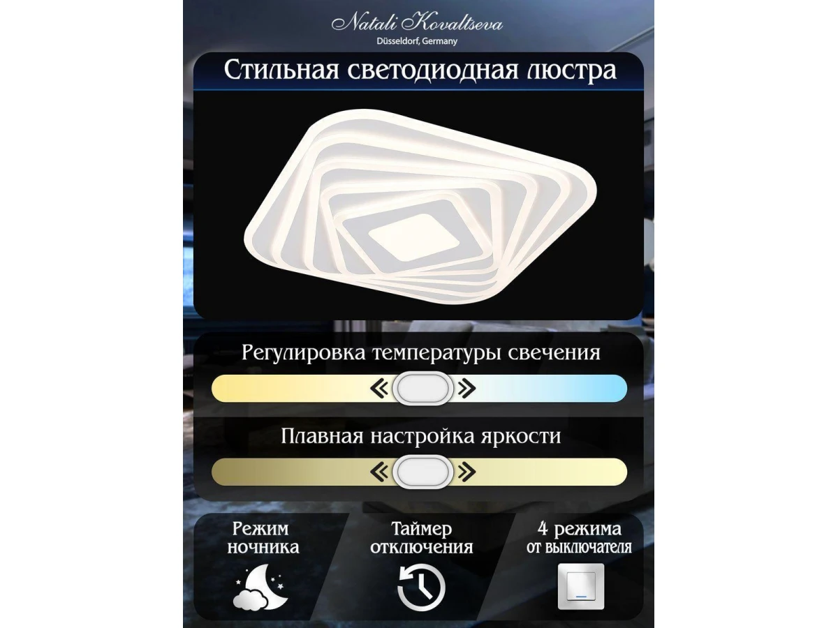Уникальная модель Led Lamps 81068 от немецкой компании Natali Kovaltseva относится к коллекции Led и отлично подойдет для установки на низкий потолок в гостиной, оформленной в стиле хай-тек. Потолочный светодиодный светильник Natali Kovaltseva Led Lamps 81068 с квадратными плафонами осветит помещение площадью 25 кв. м. холодным светом. Осветительный элемент встроен в конструкцию и не требует приобретения дополнительных лампочек. Прибор произведен с использованием материалов: пластик, металл и акрил и может использоваться для натяжного потолка. В комплект поставки входит пульт дистанционного управления. Основным цветом товара является белый. Потолочный светодиодный светильник Led Lamps 81068 с диммером продается по цене 10985 руб, с дисконтом 31% - ваша выгода при покупке составит 4931 руб. Торопитесь сделать заказ в интернет-магазине ВоронежСвет.