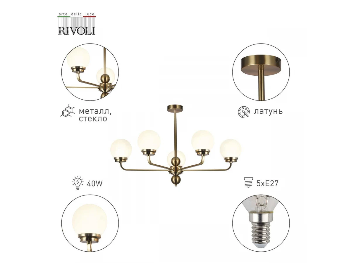 Интересная модель 5100-305 от итальянской компании Rivoli относится к коллекции Gayle. Подвесная люстра Rivoli Gayle 5100-305 Б0055657 осветит помещение площадью 15 кв. м. Производитель Rivoli рекомендует использовать для устройства лампы накаливания с цоколем E27 и мощностью 40 W. Прибор произведен с использованием материалов: стекло и металл и может использоваться для натяжного потолка. Основным цветом товара является латунный и белый. Подвесная люстра 5100-305 Б0055657 продается по цене 13441 руб. Торопитесь сделать заказ в интернет-магазине ВоронежСвет.