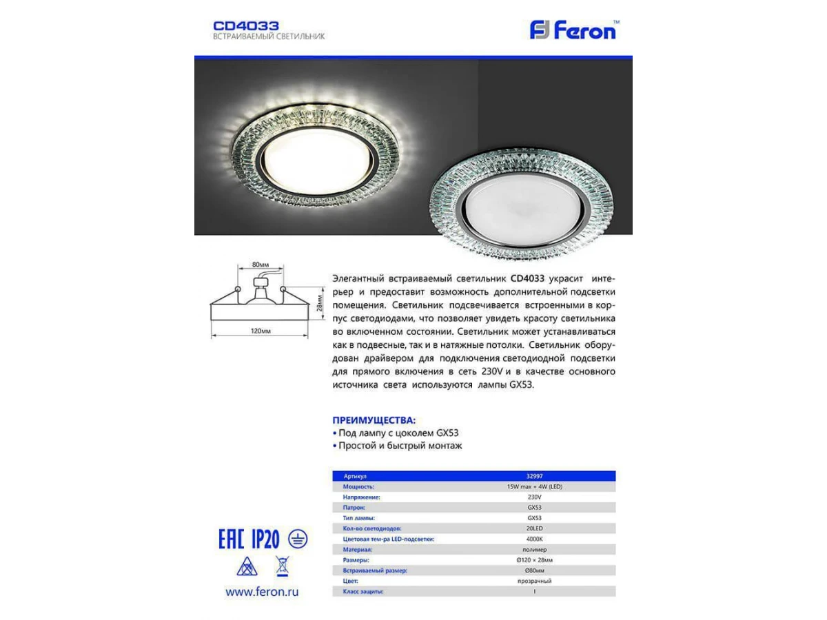 Встраиваемый светильник Feron CD4033 32997