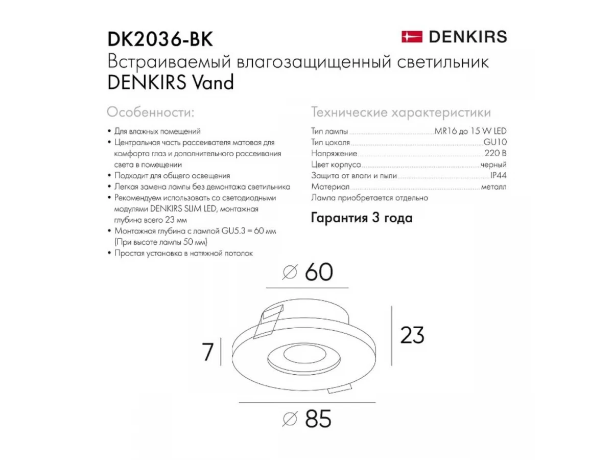 Неподражаемая модель DK2036-BK от словенской компании Denkirs относится к коллекции DK2036 и отлично подойдет для установки ванной, оформленной в современном стиле. Встраиваемый светильник Denkirs DK2036-BK с круглыми плафонами осветит помещение площадью 1 кв. м. Производитель Denkirs рекомендует использовать для устройства светодиодные лампы с цоколем GU10 и мощностью 15 W. Прибор произведен с использованием материалов: стекло и алюминий и может использоваться для натяжного потолка. Основным цветом товара является черный. Встраиваемый светильник DK2036-BK продается по цене 920 руб, с дисконтом 29% - ваша выгода при покупке составит 370 руб. Торопитесь сделать заказ в интернет-магазине ВоронежСвет.