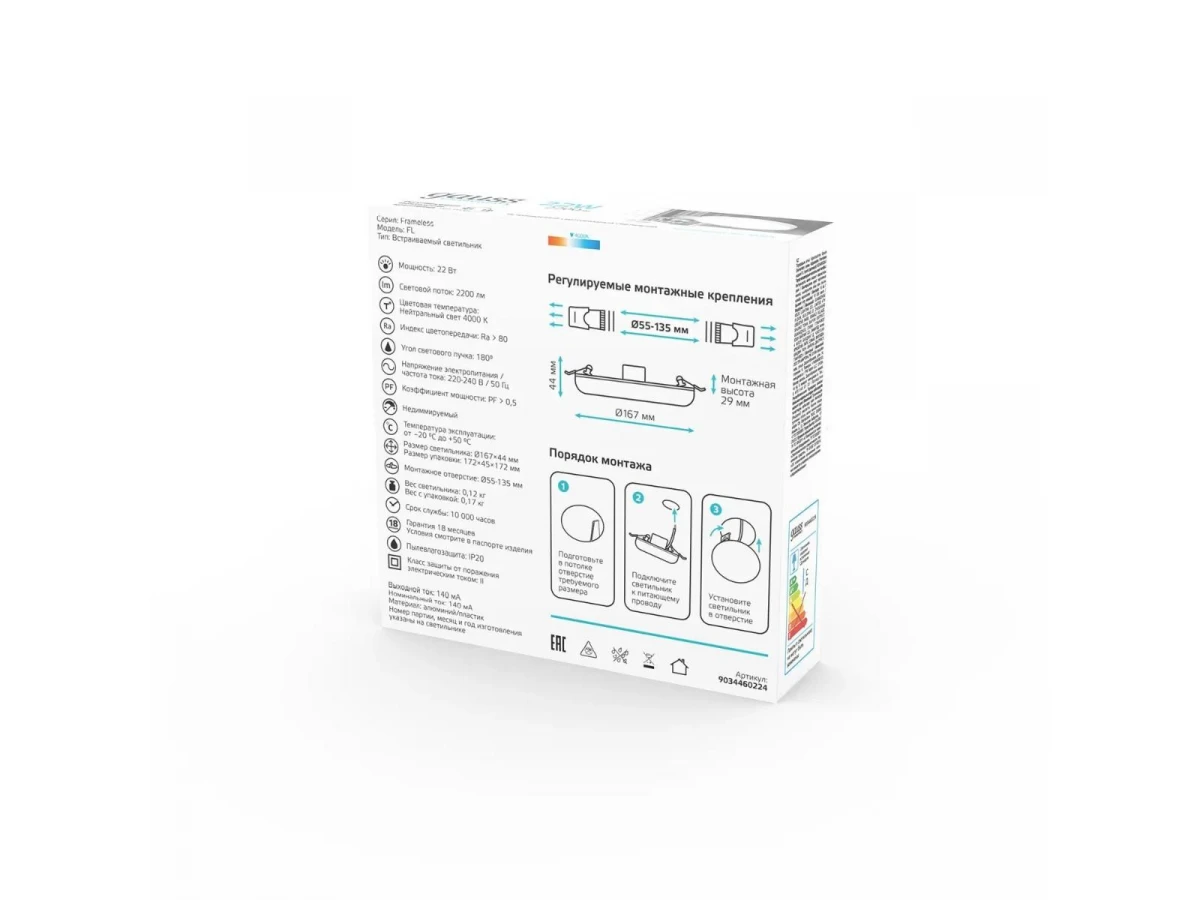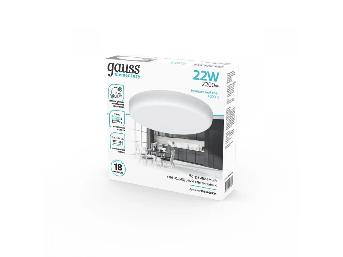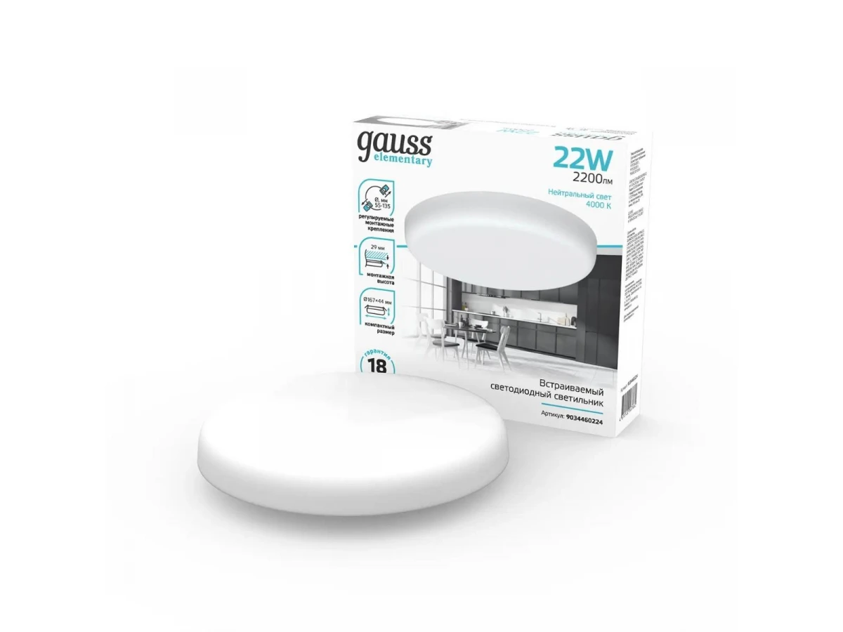 Стильная модель 9034460224 от российской компании Gauss относится к коллекции Adjustable Frameless и отлично подойдет для установки на потолок офиса, оформленном в современном стиле. Осветительный элемент встроен в конструкцию и не требует приобретения дополнительных лампочек. Прибор произведен с использованием материалов: металл, алюминий и пластик. Основным цветом товара является белый. Встраиваемый светодиодный светильник Elementary 9034460224 продается по цене 735 руб. Торопитесь сделать заказ в интернет-магазине ВоронежСвет.