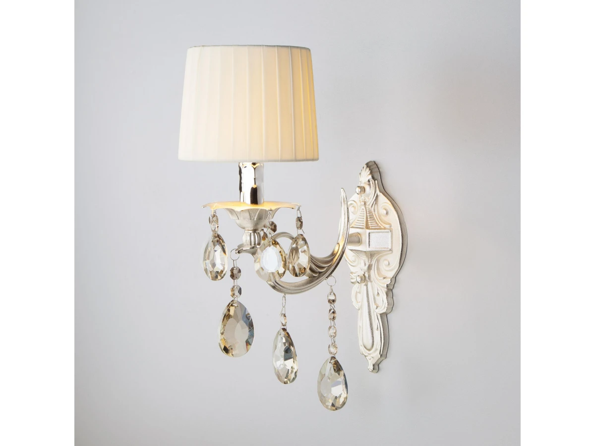 Серебряное бра с абажуром 10098/1 серебро/тонированный хрусталь Strotskis создаст качественное дополнительное освещение и станет ярким дополнением к основному источнику света. Благодаря тканевому абажуру бра создает мягкое рассеянное свечение, подходящее для комфортного чтения книг в вечернее время. В качестве источника света используются сменные лампы типа "Свеча" или "Шар" с цоколем E14. Патрон рассчитан на максимальную мощность ламп накаливания 40 Вт. Корпус светильника выполнен из высококачественного и прочного металла с надежным покрытием и украшен декоративной хрустальной подвеской. Бра легко устанавливается при помощи крепежной планки, которая обеспечивает надежную фиксацию светильника на стене. В интернет-магазине Минимир вы можете купить настенный светильник с доставкой по Москве, Санкт-Петербургу и России.