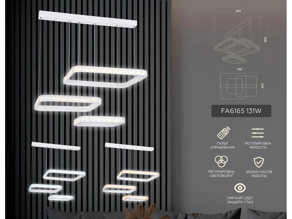 Поразительная модель FA6165 от российской компании Ambrella light относится к коллекции Original и отлично подойдет для установки на потолок в гостиной, оформленной в стиле хай-тек. Подвесной светодиодный светильник Ambrella light Original FA6165 с квадратными плафонами осветит помещение площадью 23 кв. м. холодным светом. Осветительный элемент встроен в конструкцию и не требует приобретения дополнительных лампочек. Прибор произведен с использованием материалов: пластик, металл и акрил и может использоваться для натяжного потолка. В комплект поставки входит пульт дистанционного управления. Основным цветом товара является белый. Подвесной светодиодный светильник FA6165 с диммером продается по цене 22005 руб. Торопитесь сделать заказ в интернет-магазине ВоронежСвет.