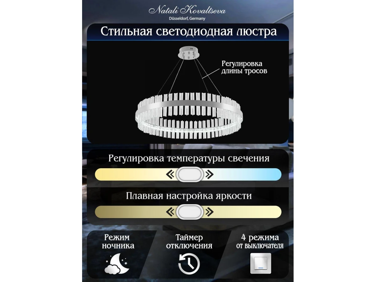 Оригинальная модель Innovation Style 83014 от немецкой компании Natali Kovaltseva относится к коллекции Smart Нимбы и отлично подойдет для установки на потолок в гостиной, оформленной в стиле модерн. Подвесной светодиодный светильник Natali Kovaltseva Smart Нимбы Innovation Style 83014 с цилиндрическими плафонами осветит помещение площадью 25 кв. м. холодным светом. Осветительный элемент встроен в конструкцию и не требует приобретения дополнительных лампочек. Прибор произведен с использованием материалов: хрусталь и металл и может использоваться для натяжного потолка. В комплект поставки входит пульт дистанционного управления. Основным цветом товара является хромовый и серебристо-стальной. Торопитесь сделать заказ в интернет-магазине ВоронежСвет.