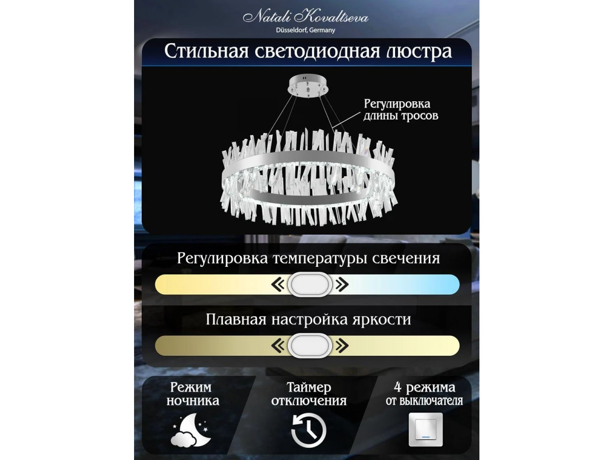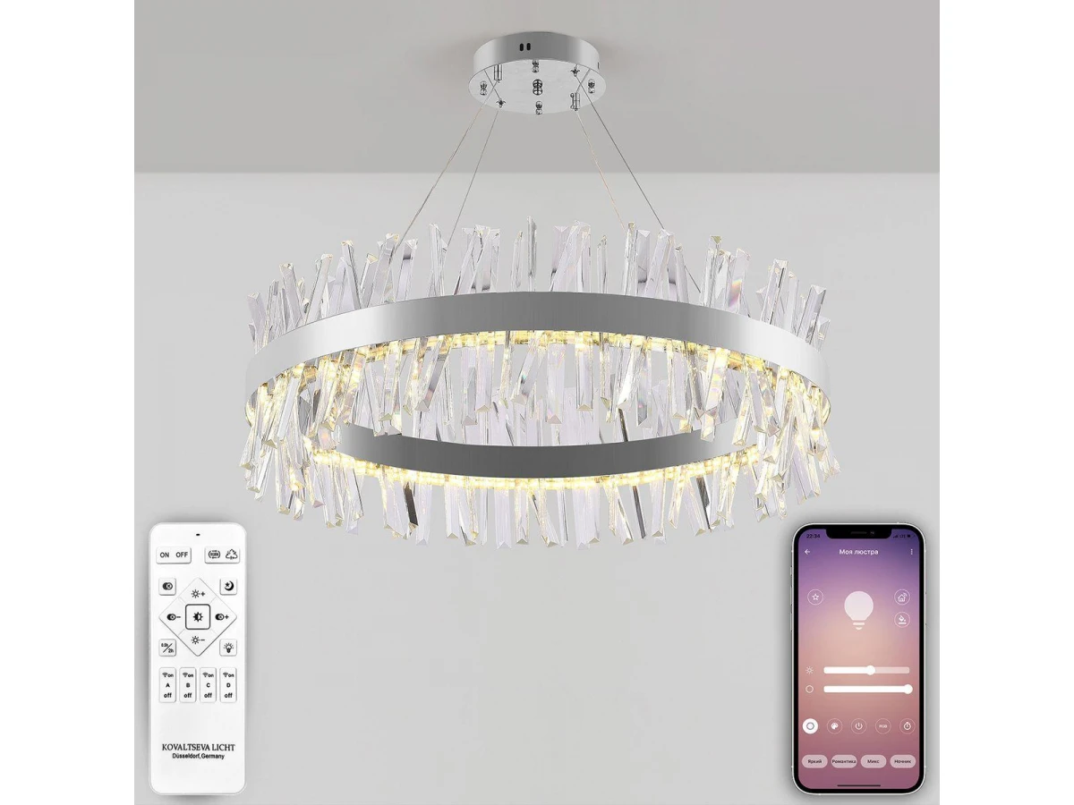 Роскошная модель Innovation Style 83050 от немецкой компании Natali Kovaltseva относится к коллекции Smart Нимбы и отлично подойдет для установки на потолок в гостиной, оформленной в стиле модерн. Подвесной светодиодный светильник Natali Kovaltseva Smart Нимбы Innovation Style 83050 с цилиндрическими плафонами осветит помещение площадью 25 кв. м. холодным светом. Осветительный элемент встроен в конструкцию и не требует приобретения дополнительных лампочек. Прибор произведен с использованием материалов: хрусталь и металл и может использоваться для натяжного потолка. В комплект поставки входит пульт дистанционного управления. Основным цветом товара является хромовый и серебристо-стальной. Подвесной светодиодный светильник Innovation Style 83050 с диммером продается по цене 33187 руб, с дисконтом 35% - ваша выгода при покупке составит 17691 руб. Торопитесь сделать заказ в интернет-магазине ВоронежСвет.