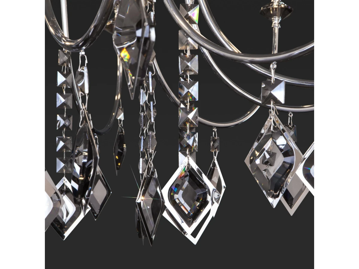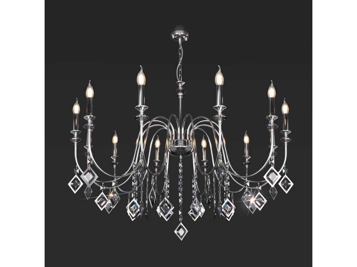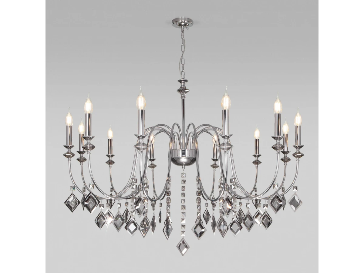Классическая хрустальная люстра на 12 рожков в цвете хром преобразит потолочное пространство и создаст в вашем помещении полноценное освещение на площади 36 м кв. Изящные формы и классический стиль добавят вашей гостиной или спальне утонченного аристократизма. Декоративные рожки в виде подсвечников, украшенные сменными лампами с цоколем E14 типа свеча на ветру переливаются на свету искристыми завораживающими бликами. В производстве подвесной люстры использовали особое стекло с выразительной огранкой и высококачественный металл с прочным защитным покрытием. В интернет-магазине Минимир легко купить подвесную хрустальную люстру с доставкой по Москве, Санкт-Петербургу и России.