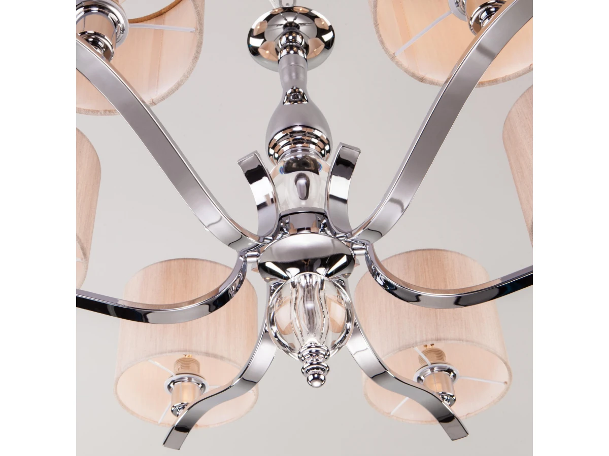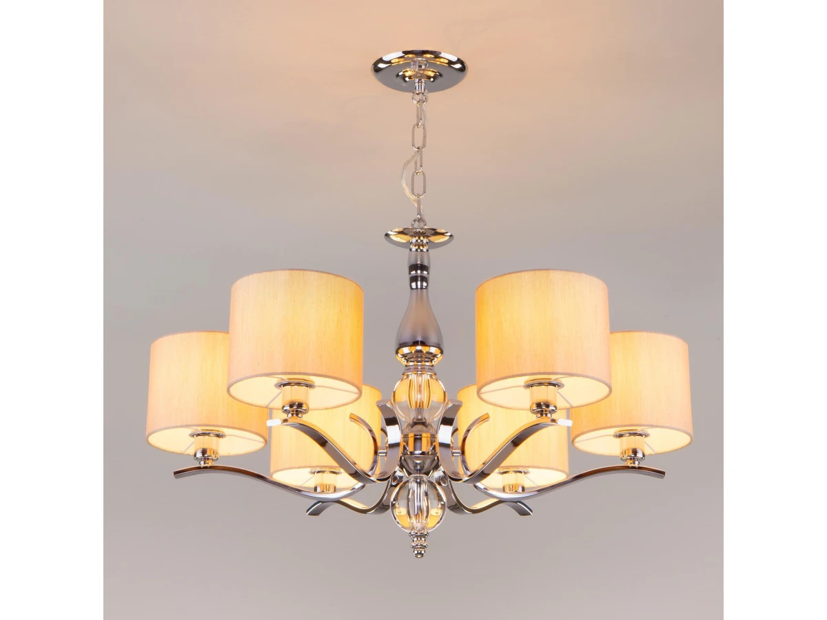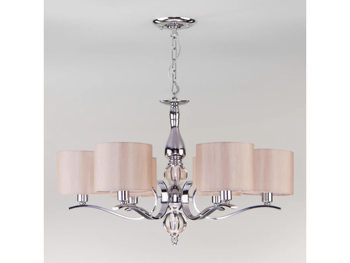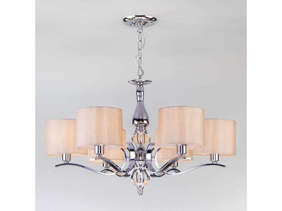 Подвесная люстра на 6 рожков в цвете хром предназначена для создания основного освещения в современных и классических интерьерах, подходит для различных типов помещений: гостиная, спальня и рассчитана на площадь освещения 16 м². Роскошная люстра оснащена патронами с цоколем Е14, которые рассчитаны на максимальную мощность ламп 40 Вт. Люстра украшена эффектным декором из хрусталя и дополнена выразительными тканевыми абажурами бежевого цвета. Арматура изготовлена из высококачественного металла с надежным защитным покрытием. В нашем интернет-магазине вы можете купить подвесную люстру по выгодной цене.