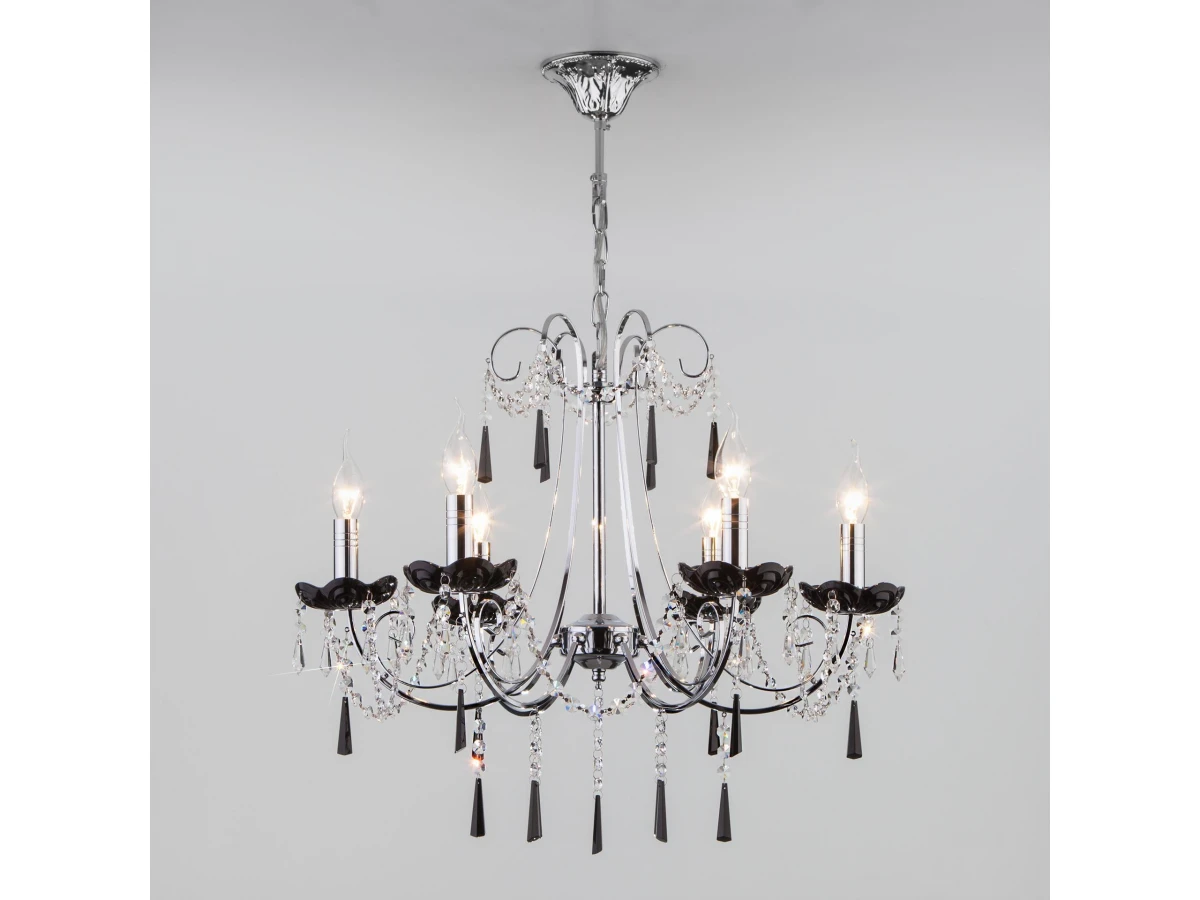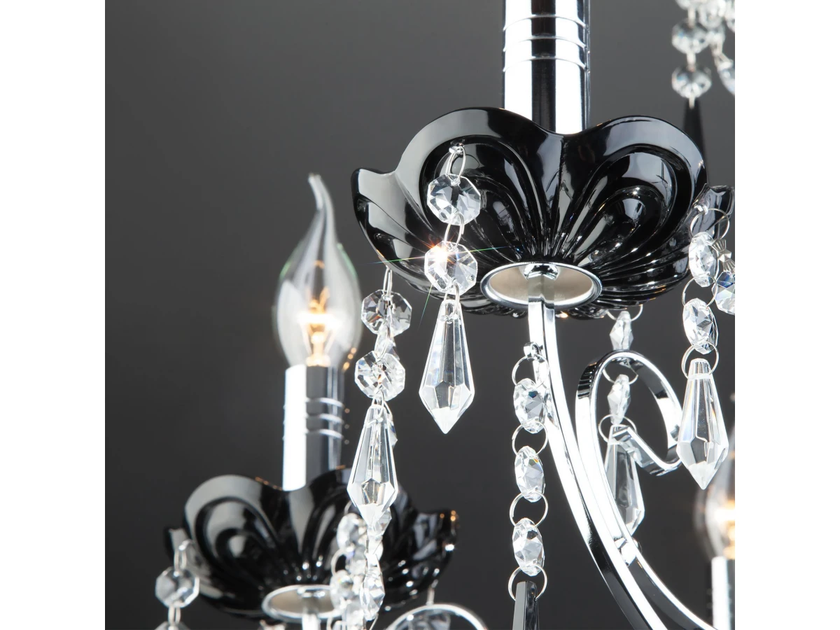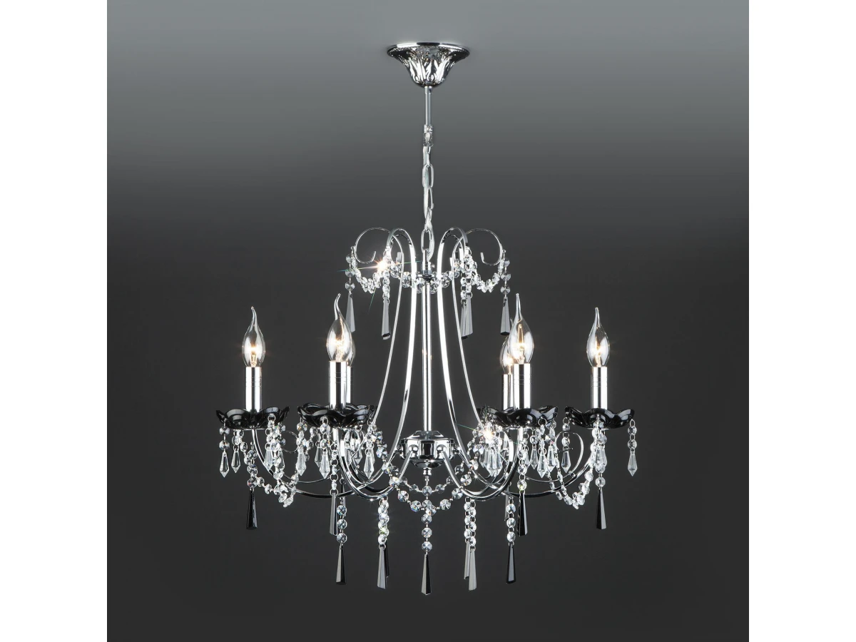 Классическая хрустальная люстра на 6 рожков в цвете хром/черный преобразит потолочное пространство и создаст в вашем помещении комфортное полноценное освещение на площади 29 м кв. Изящные формы и классический стиль добавят вашей гостиной утонченного аристократизма. Декоративные рожки в виде подсвечников, украшенные сменными лампами с цоколем E14 типа свеча на ветру переливаются на свету яркими завораживающими бликами. В производстве подвесной люстры использовали особое стекло с эффектной огранкой и высококачественный металл с надежным защитным покрытием. В нашем интернет-магазине вы можете купить подвесную хрустальную люстру по выгодной цене с доставкой по Москве и России.