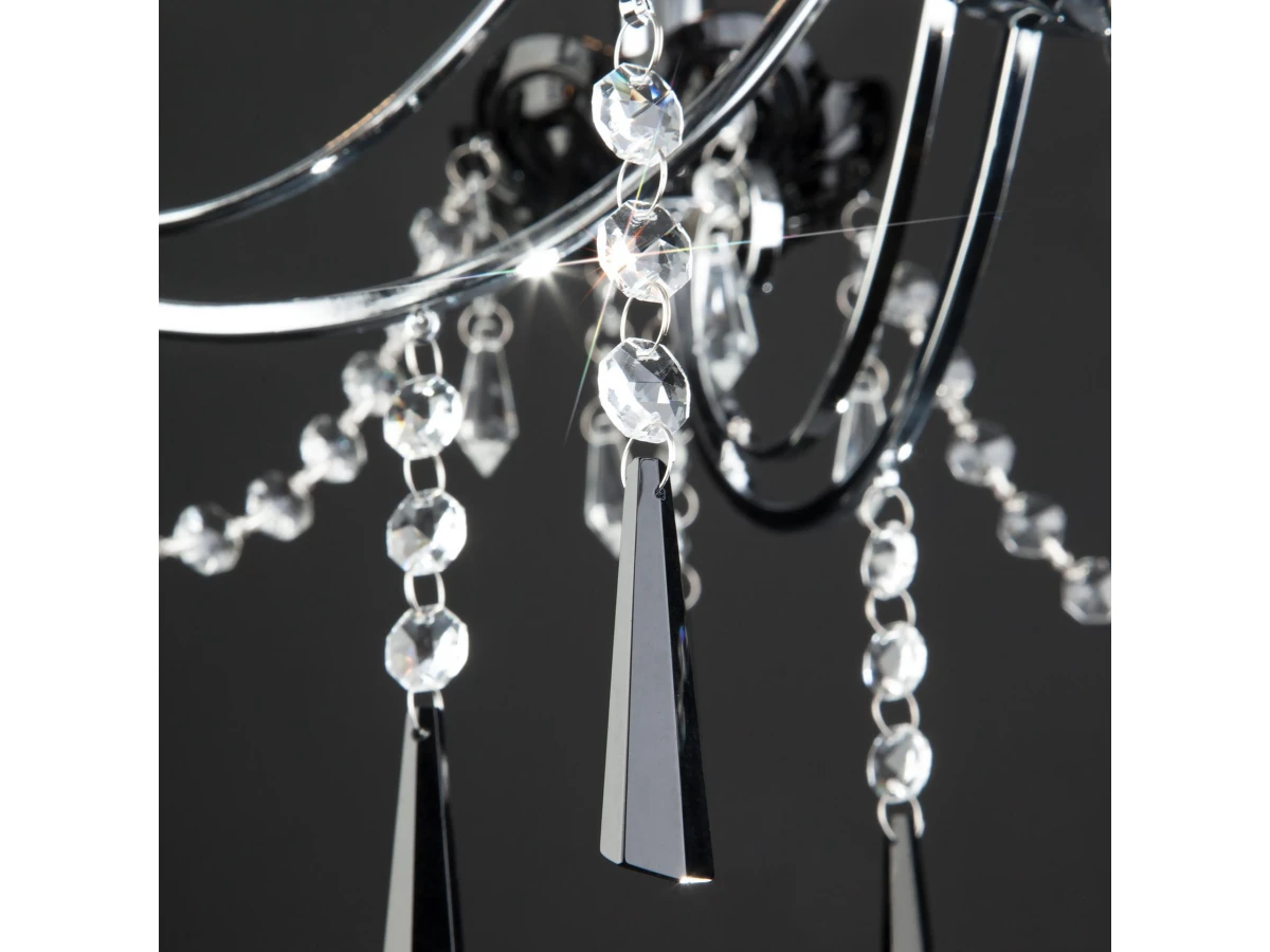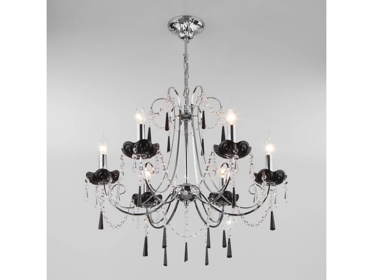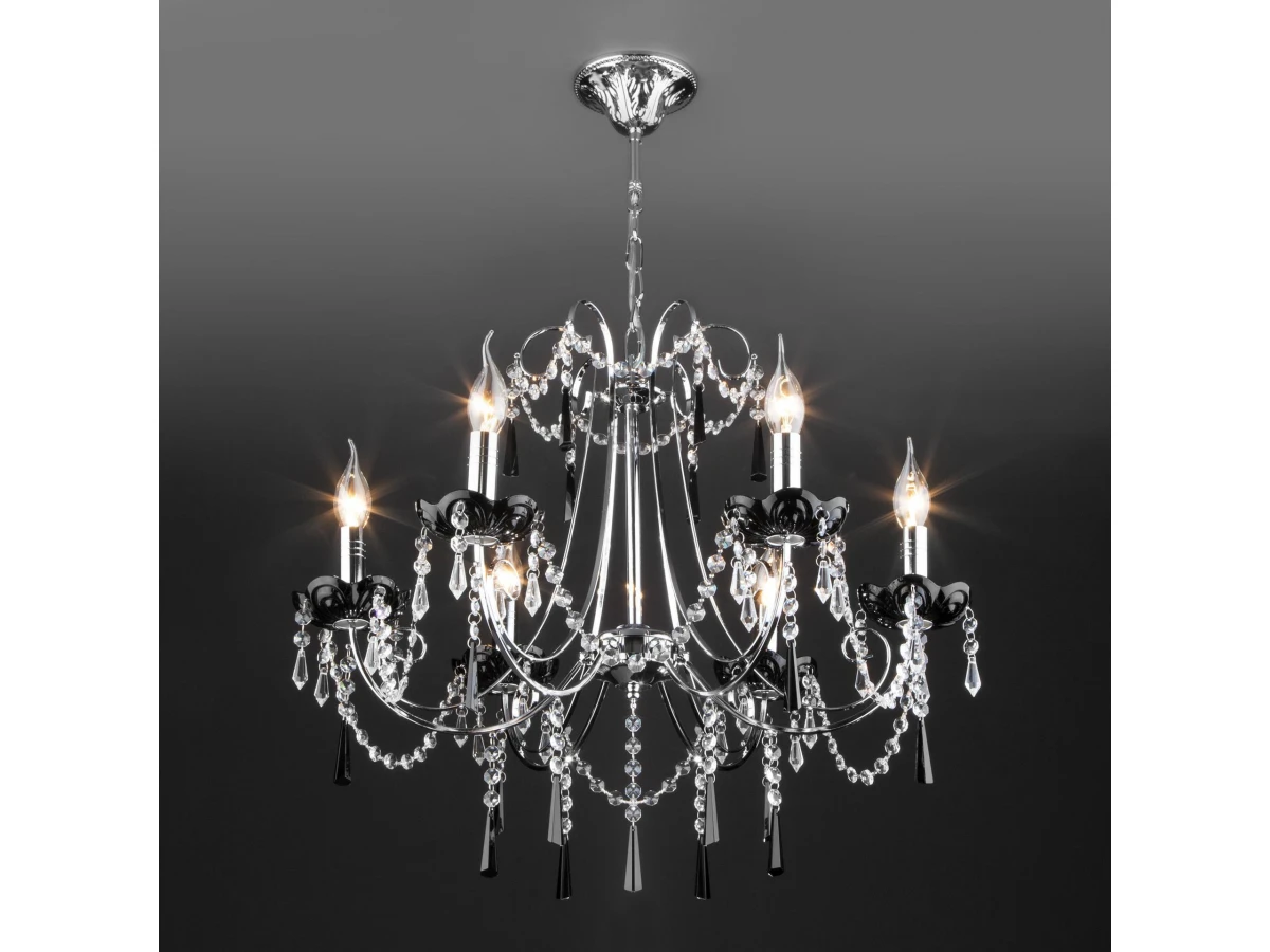 Классическая хрустальная люстра на 6 рожков в цвете хром/черный преобразит потолочное пространство и создаст в вашем помещении комфортное полноценное освещение на площади 29 м кв. Изящные формы и классический стиль добавят вашей гостиной утонченного аристократизма. Декоративные рожки в виде подсвечников, украшенные сменными лампами с цоколем E14 типа свеча на ветру переливаются на свету яркими завораживающими бликами. В производстве подвесной люстры использовали особое стекло с эффектной огранкой и высококачественный металл с надежным защитным покрытием. В нашем интернет-магазине вы можете купить подвесную хрустальную люстру по выгодной цене с доставкой по Москве и России.