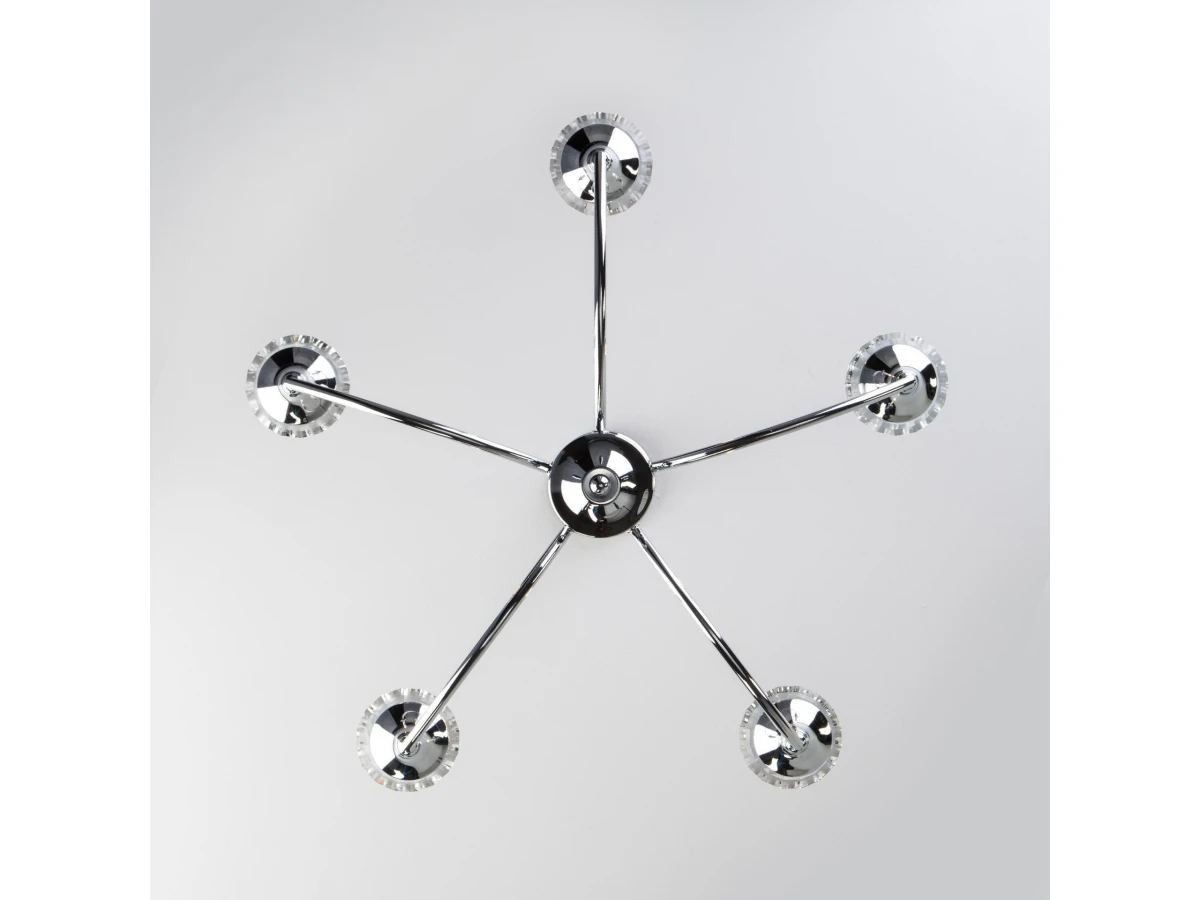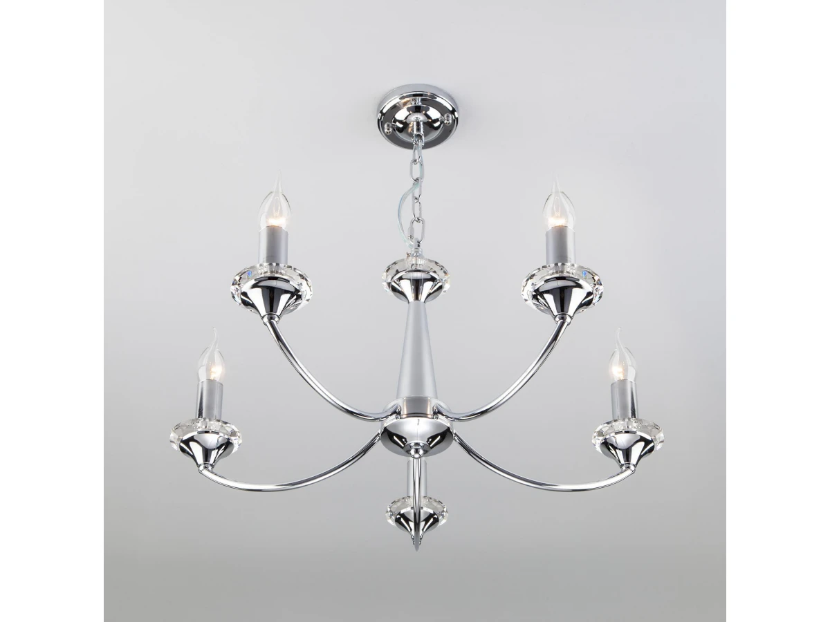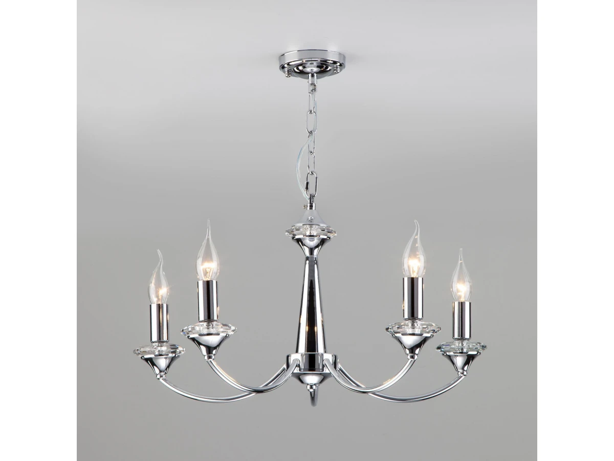 Выразительная хрустальная люстра на 5 рожков в цвете хром преобразит потолочное пространство и создаст в вашем помещении полноценное освещение на площади 21 м кв. Красивые формы и классический стиль добавят вашей гостиной или спальне утонченного аристократизма. Декоративные рожки в виде подсвечников, украшенные сменными лампами с цоколем E14 типа свеча на ветру переливаются на свету яркими завораживающими бликами. В производстве подвесной люстры использовали высококачественный металл с прочным защитным покрытием. В нашем интернет-магазине вы можете купить подвесную хрустальную люстру по выгодной цене с доставкой по Москве и России.