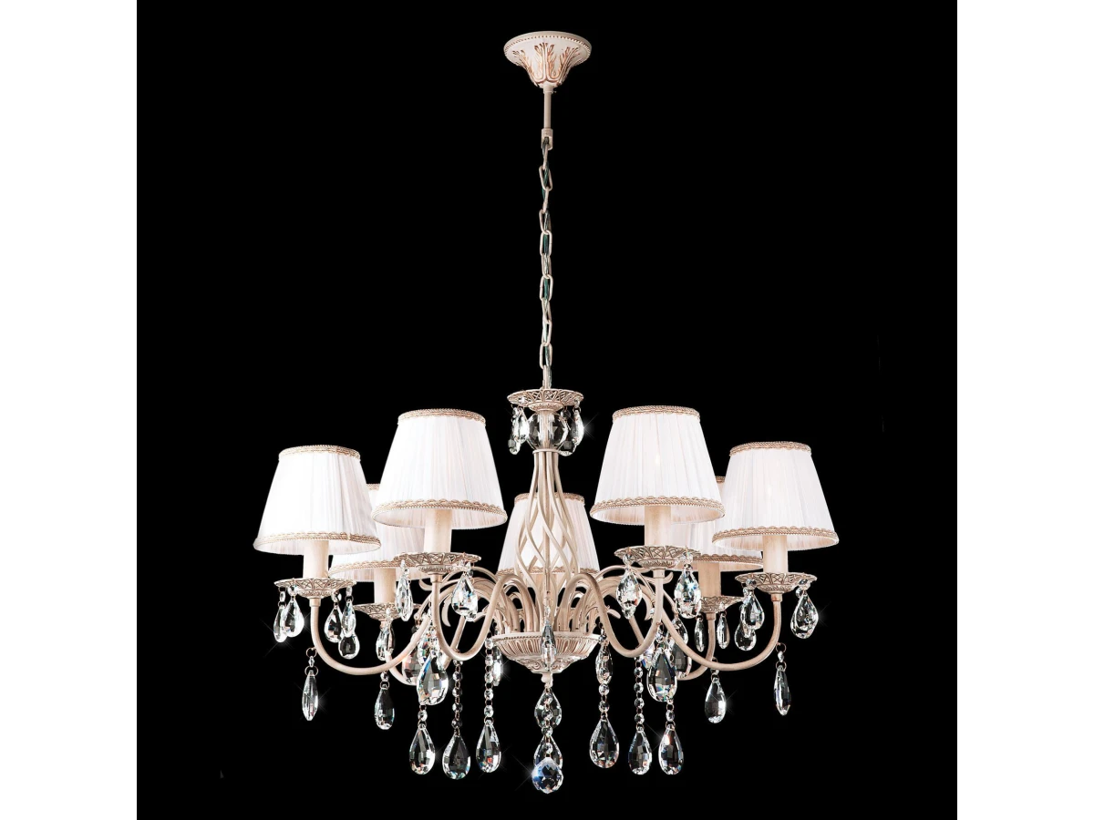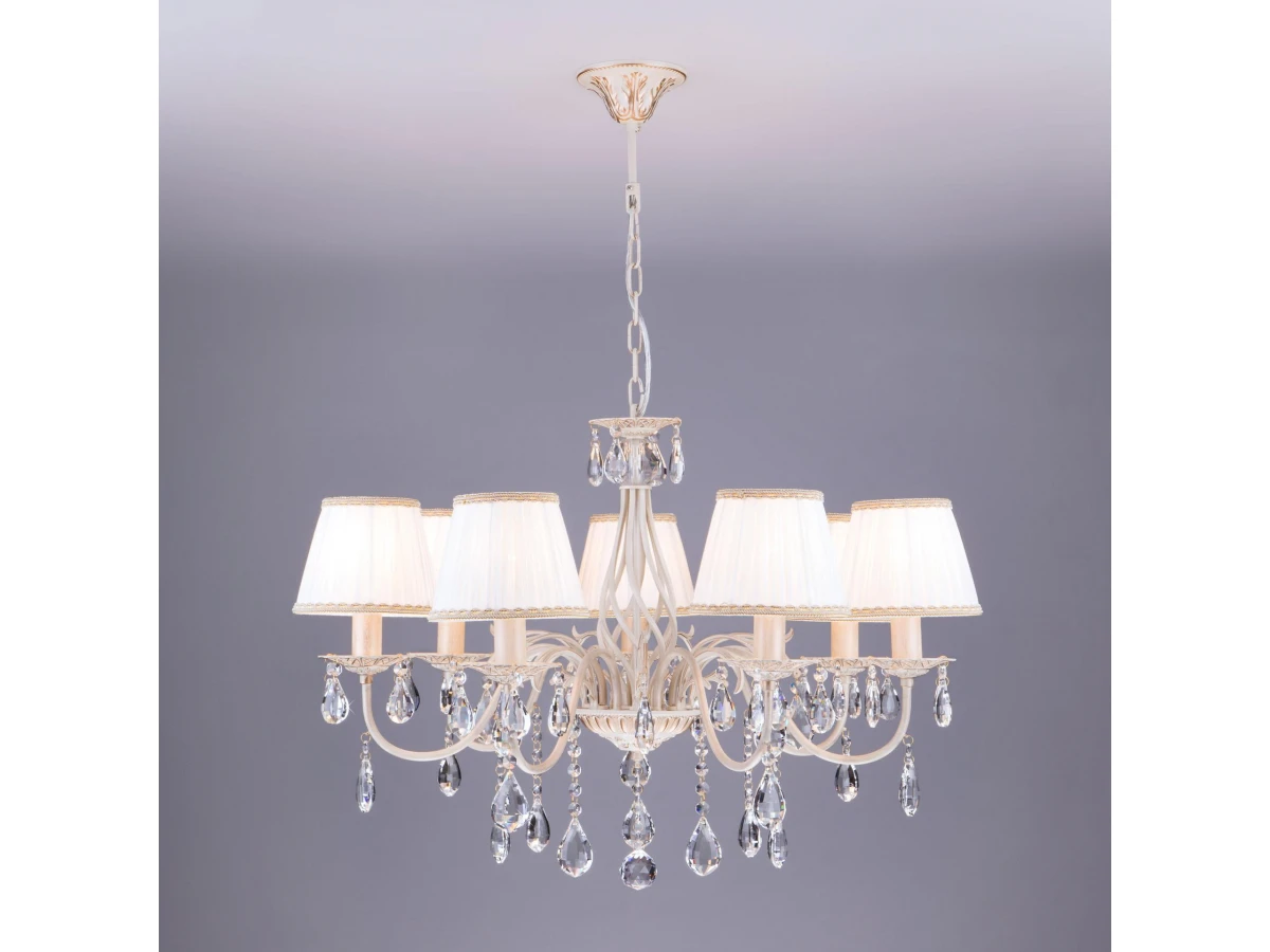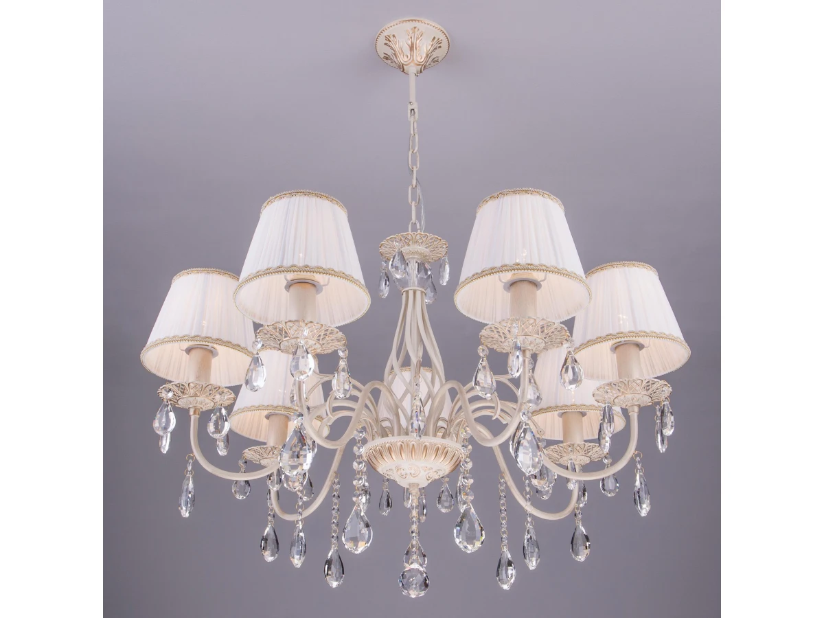 Подвесная люстра с хрусталем и абажурами 3637/7 белый с золотом / прозрачный хрусталь предназначена для создания основного освещения в современных и классических интерьерах, подходит для различных типов помещений: гостиная, спальня и рассчитана на площадь освещения 22 м². Роскошная люстра оснащена патронами с цоколем Е14, которые рассчитаны на максимальную мощность ламп 40 Вт. Люстра украшена эффектным декором из хрусталя и дополнена выразительными тканевыми абажурами. Арматура изготовлена из высококачественного металла с надежным защитным покрытием. В нашем интернет-магазине вы можете купить подвесную люстру по выгодной цене.
