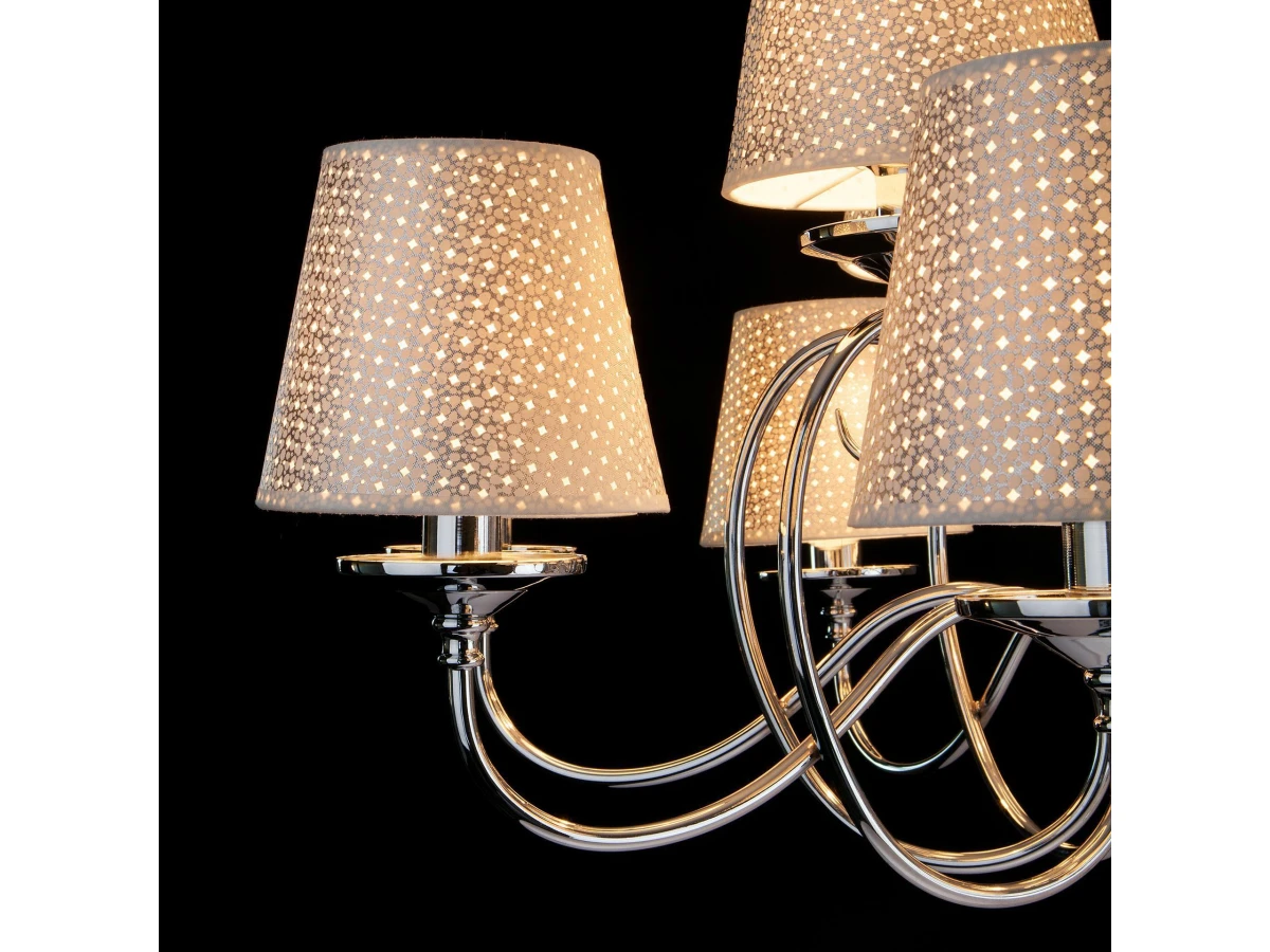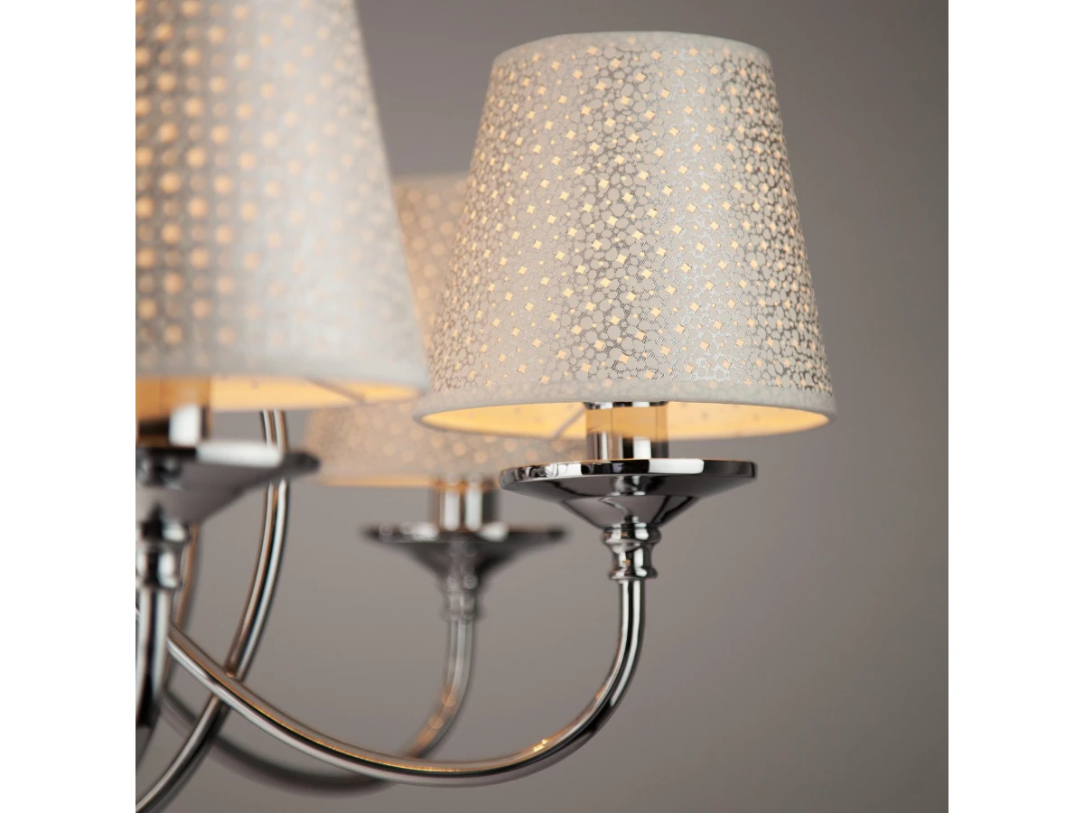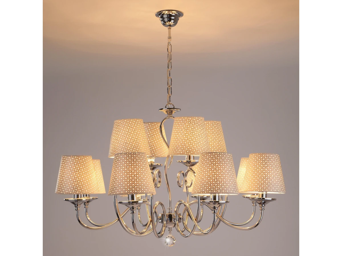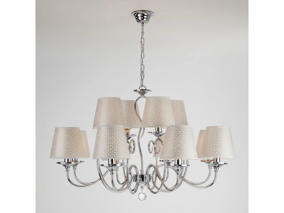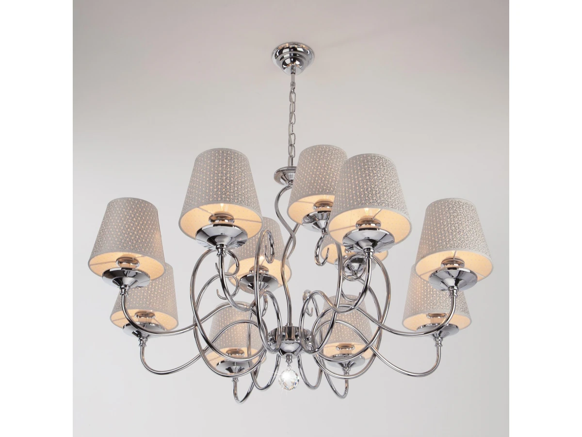 Люстра 70068/12 в стиле Классика - настоящее произведение искусства и украшение любой комнаты. Тканевые абажуры нежного серого цвета гармонично дополняют хромированное основание светильника. Изысканная хрустальная подвеска переливаться на свету всеми гранями и придает светильнику особое очарование. Люстра подходит для различных типов помещений: гостиная, спальня и рассчитана на площадь освещения 48м². Она оснащена патронами с цоколем Е14, которые рассчитаны на максимальную мощность ламп 40 Вт. Купить по доступной цене люстру в классическом стиле можно в интернет-магазине "Евросвет" с доставкой по России и странам СНГ.