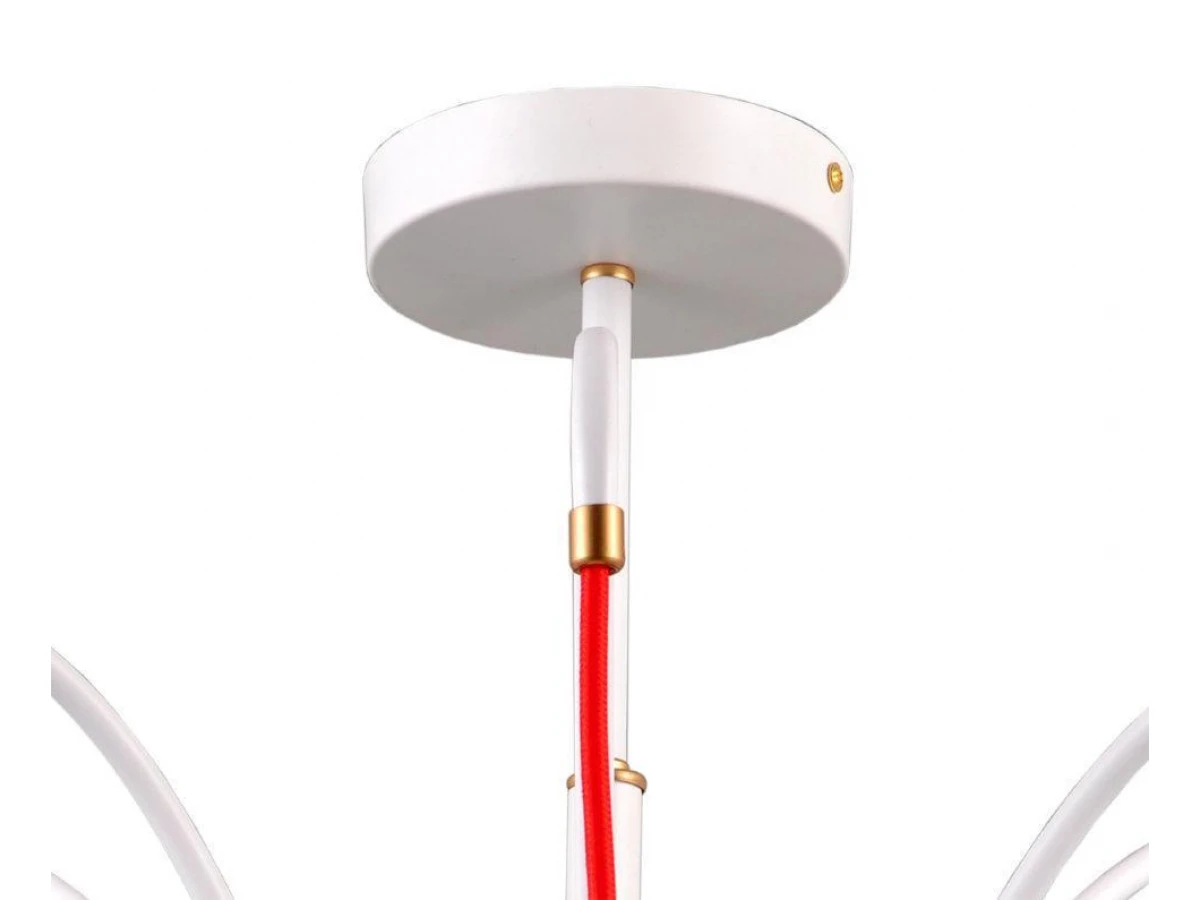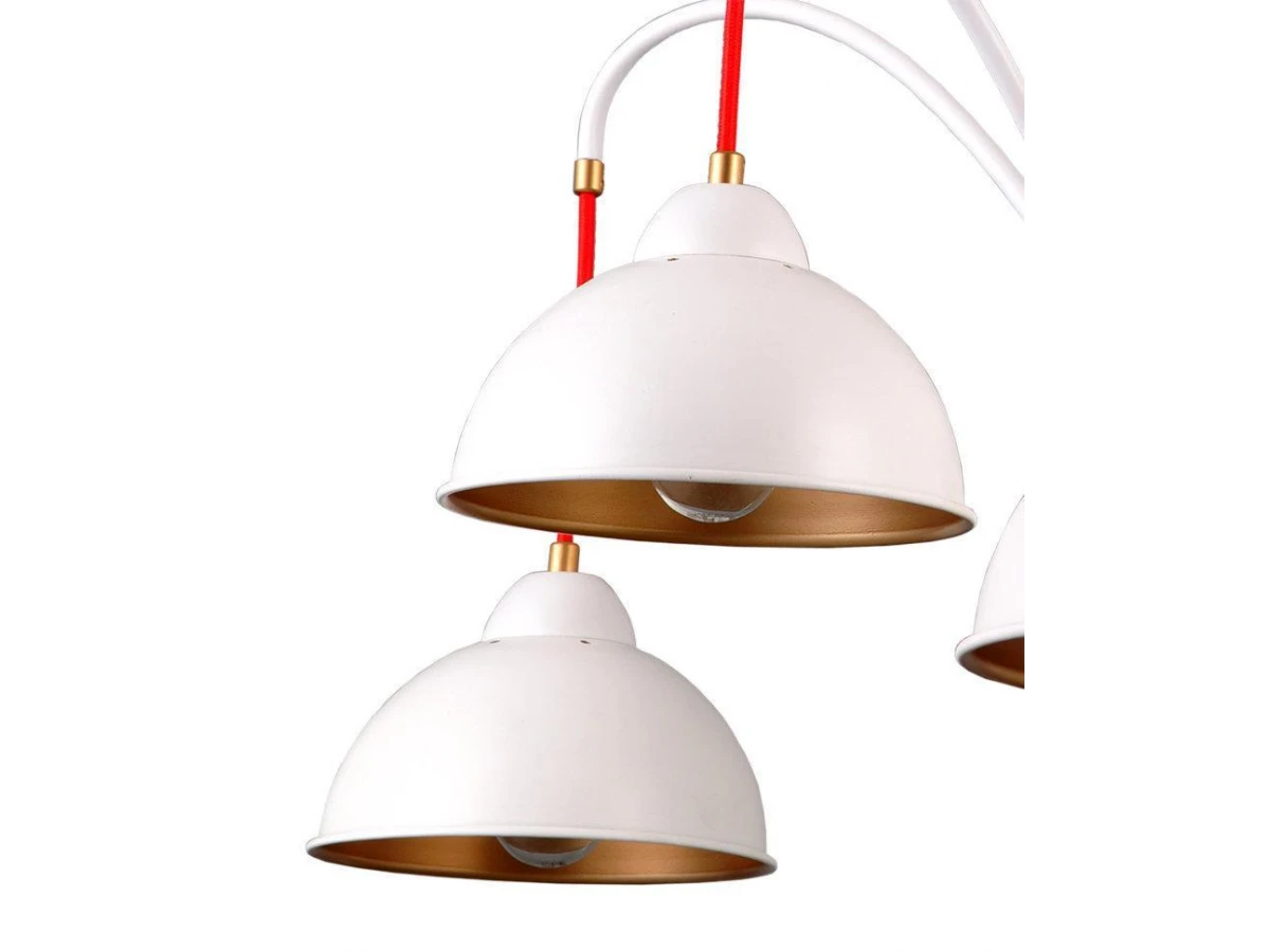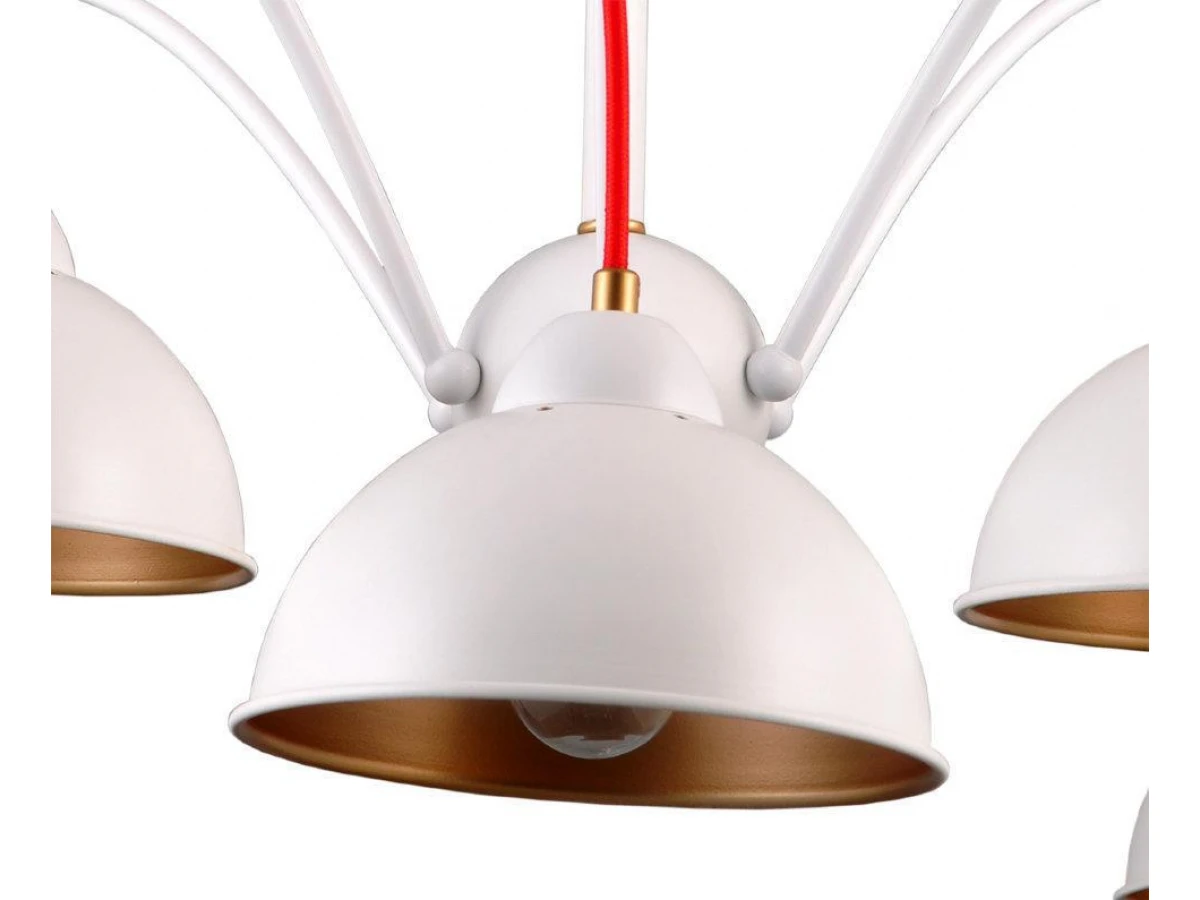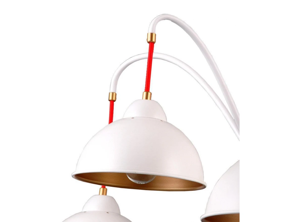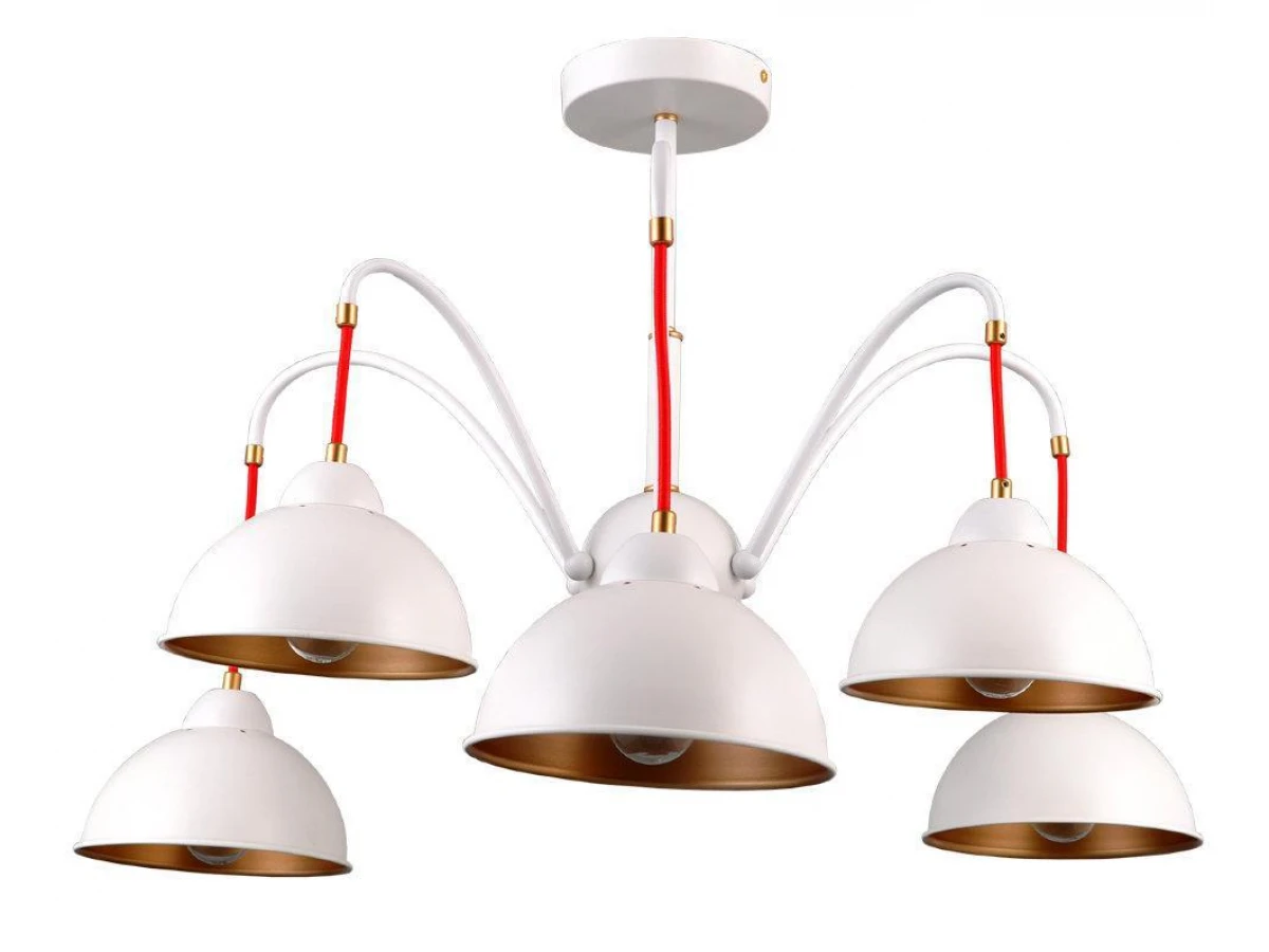 ДЖУЛИЯ. Основа люстры и плафонов - металл белого цвета. Благодаря именно такой форме плафонов световой поток направлен строго вниз, внутренне золотое покрытие мягко отражает свет, а общий дизайн люстры создает легкую, незримую иллюзию движения. Яркое и неординарное дополнение шнуры красного цвета. Акцент Вашему дому обеспечен.