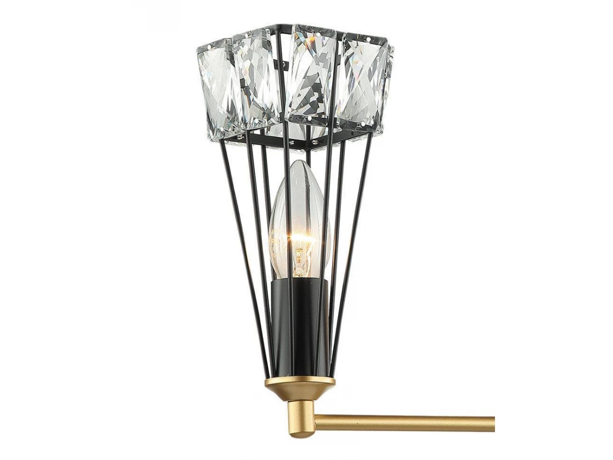 ВЕЛЕС. Строгость линий, матовое золото и черный бархат металла, незамысловатость форм и сияние прозрачных пластин хрусталя - все идеальным пазлом сложилось в светильниках серии "ВЕЛЕС". Стильным украшением интерьера станет любая из моделей предлагаемой серии, наполняя его ярким светом, вырывающимся из оков металлической клетки.