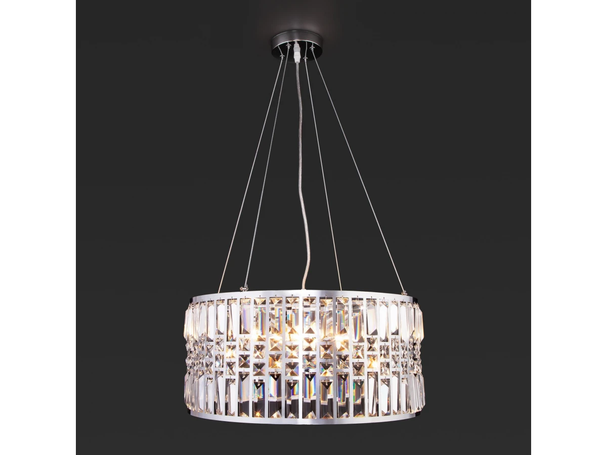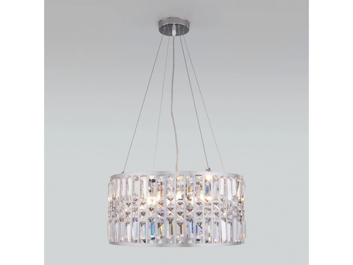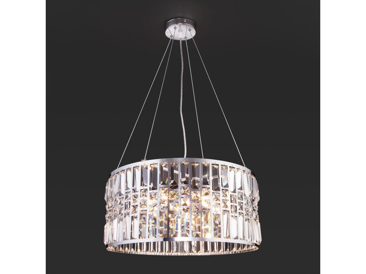 Выразительная люстра с хрусталем на 5 рожков в цвете хром преобразит потолочное пространство и создаст в вашем помещении полноценное освещение на площади 15 м кв. Декоративные хрустальные пластины, украшенные сменными лампами с цоколем E14 типа свеча переливаются на свету искристыми завораживающими бликами. В производстве подвесной люстры использовали особое стекло с эффектной огранкой и высококачественный металл с надежным защитным покрытием. В интернет-магазине Минимир легко купить подвесную хрустальную люстру с доставкой по Москве, Санкт-Петербургу и России.