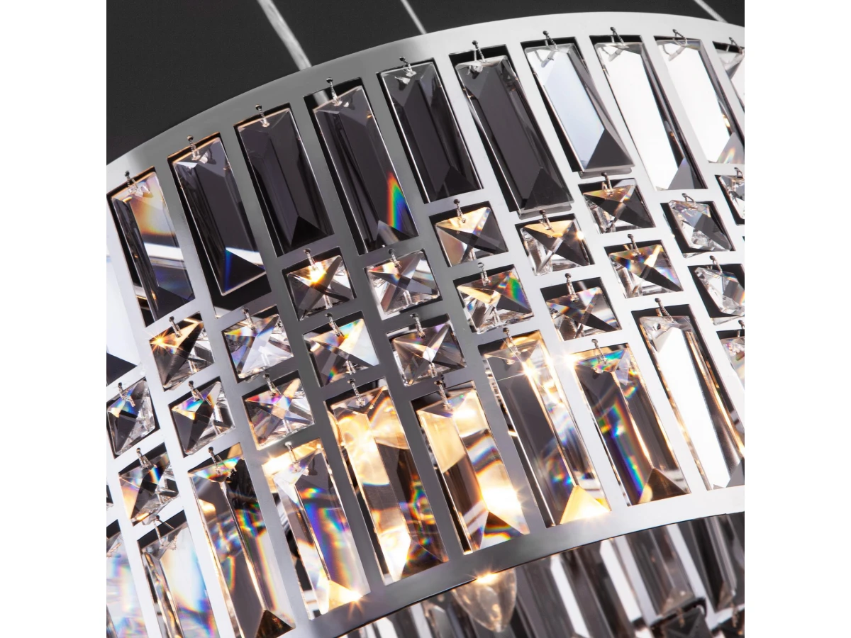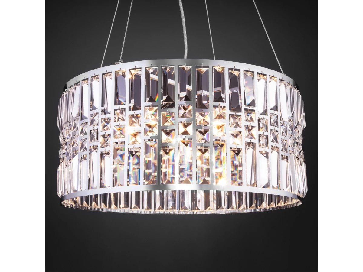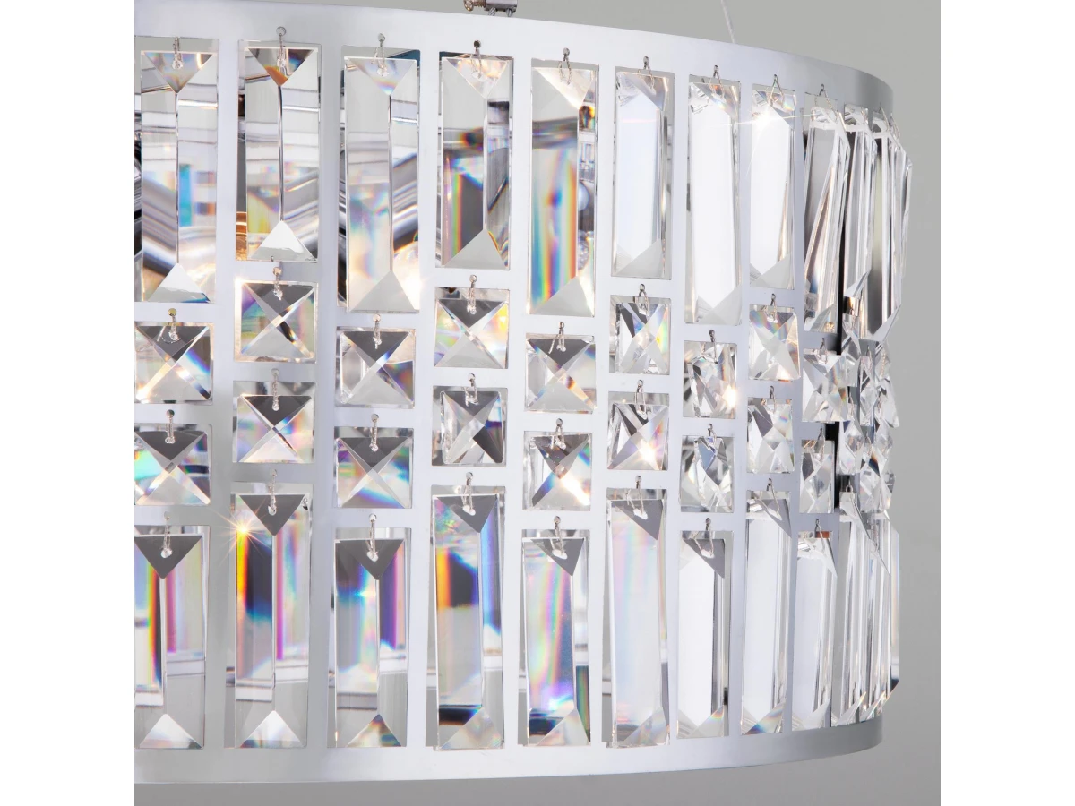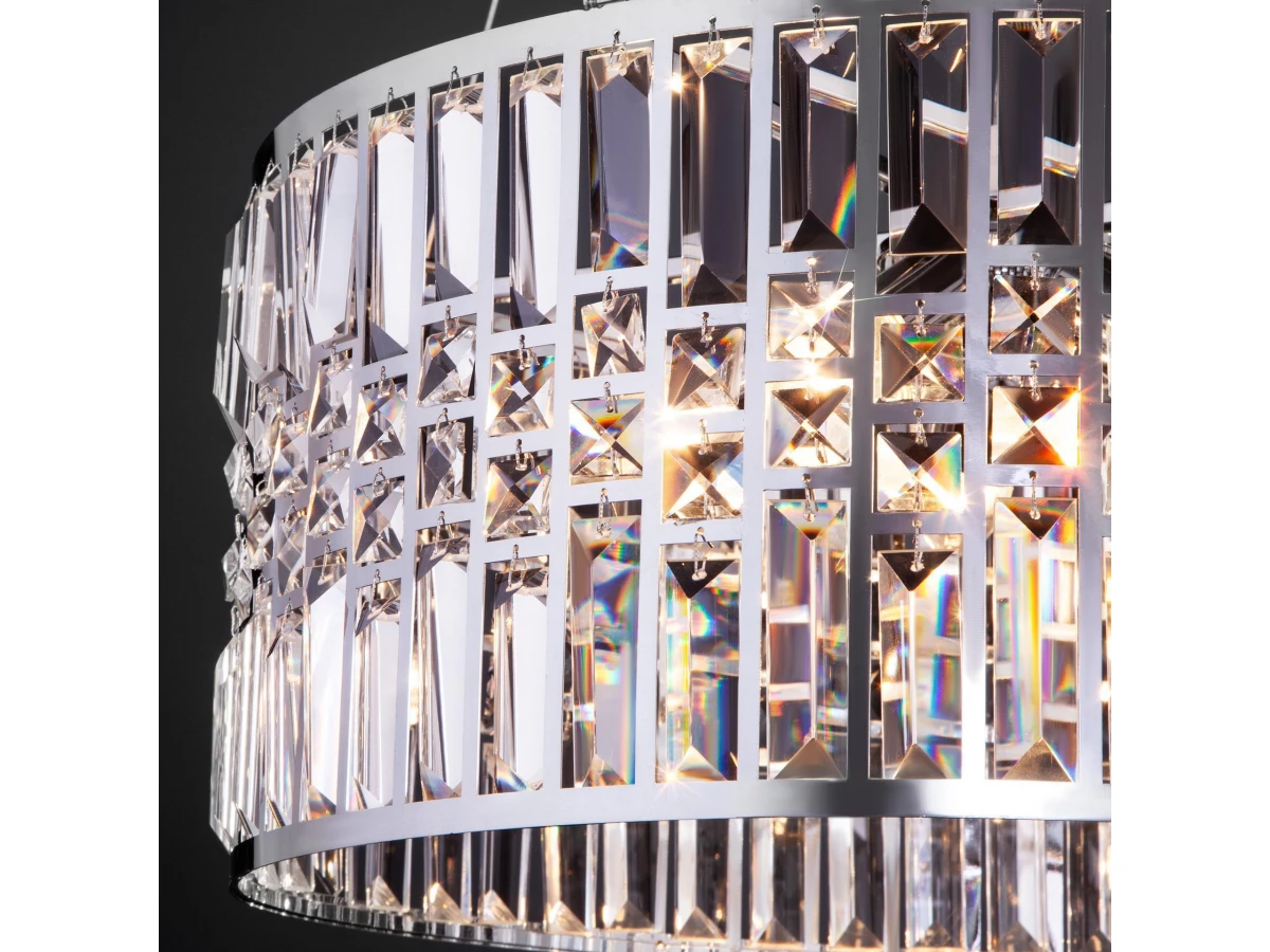 Выразительная люстра с хрусталем на 5 рожков в цвете хром преобразит потолочное пространство и создаст в вашем помещении полноценное освещение на площади 15 м кв. Декоративные хрустальные пластины, украшенные сменными лампами с цоколем E14 типа свеча переливаются на свету искристыми завораживающими бликами. В производстве подвесной люстры использовали особое стекло с эффектной огранкой и высококачественный металл с надежным защитным покрытием. В интернет-магазине Минимир легко купить подвесную хрустальную люстру с доставкой по Москве, Санкт-Петербургу и России.