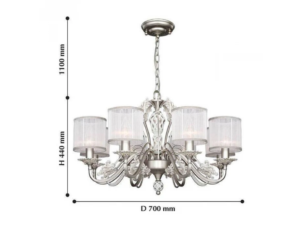 Невероятная модель 2306-8P от немецкой компании Favourite относится к коллекции Prima и отлично подойдет для установки на потолок в гостиной, оформленной в классическом стиле. Подвесная люстра Favourite Prima 2306-8P с цилиндрическими плафонами осветит помещение площадью 21.3 кв. м. Производитель Favourite рекомендует использовать для устройства лампы накаливания с цоколем E14 и мощностью 40 W. Прибор произведен с использованием материалов: текстиль, металл и органза и может использоваться для натяжного потолка. Основным цветом товара является белый и серебряный. Торопитесь сделать заказ в интернет-магазине ВоронежСвет.