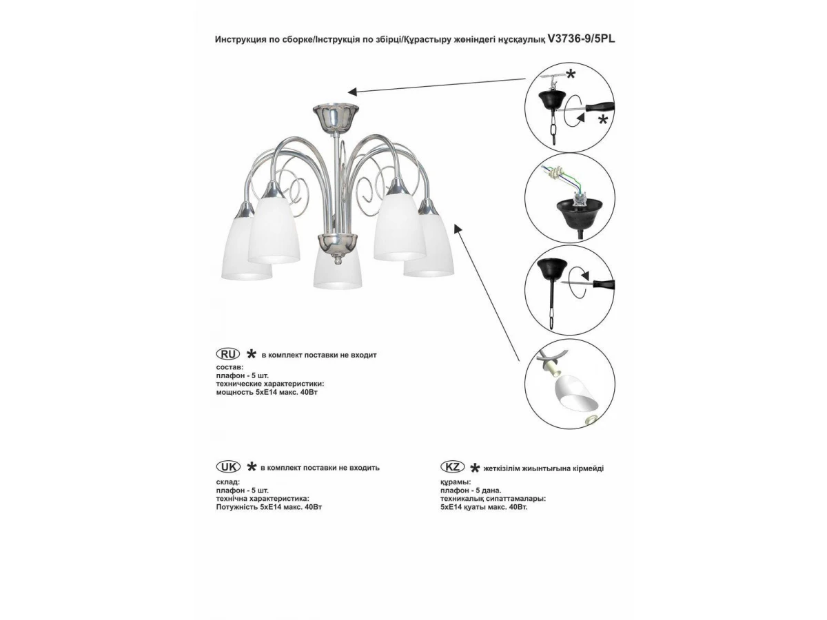 Неповторимая модель V3736-9/5PL от российской компании Vitaluce относится к коллекции V3736 и отлично подойдет для установки на потолок кухни, оформленной в стиле модерн. Потолочная люстра Vitaluce V3736-9/5PL с конусными плафонами осветит помещение площадью 15 кв. м. Производитель Vitaluce рекомендует использовать для устройства лампы накаливания с цоколем E14 и мощностью 40 W. Прибор произведен с использованием материалов: пластик и металл и может использоваться для натяжного потолка. Основным цветом товара является белый и серебряный. Потолочная люстра V3736-9/5PL продается по цене 4574 руб, с дисконтом 10% - ваша выгода при покупке составит 508 руб. Торопитесь сделать заказ в интернет-магазине ВоронежСвет.