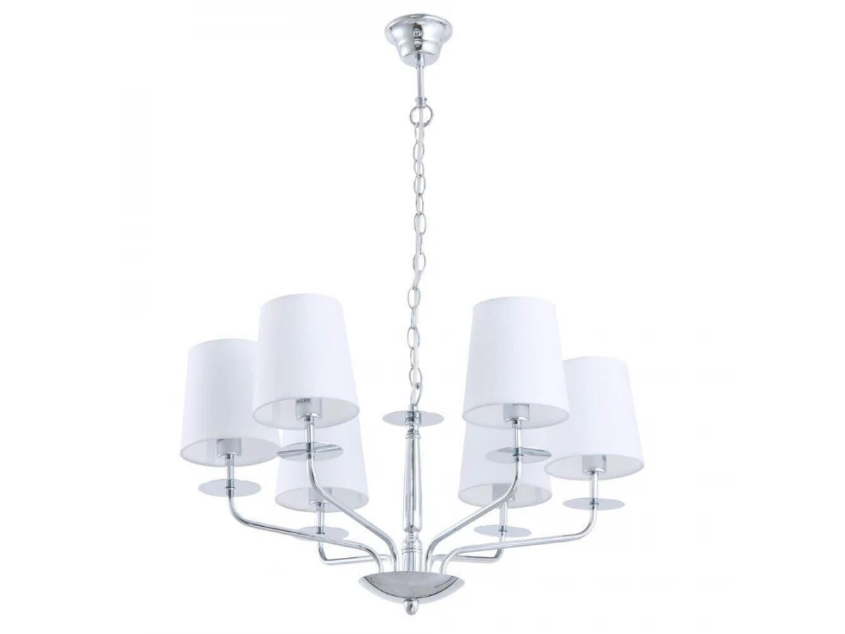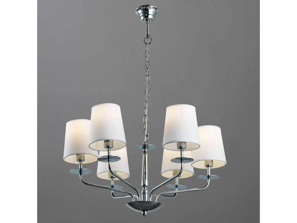 Незаурядная модель A1048LM-6CC от итальянской компании Arte Lamp относится к коллекции 1048 и отлично подойдет для установки на потолок спальни, оформленной в стиле модерн. Подвесная люстра Arte Lamp A1048LM-6CC с конусными плафонами осветит помещение площадью 16 кв. м. Производитель Arte Lamp рекомендует использовать для устройства лампы накаливания с цоколем E14 и мощностью 40 W. Прибор произведен с использованием материалов: текстиль, металл и ткань и может использоваться для натяжного потолка. Основным цветом товара является белый и хромовый. Торопитесь сделать заказ в интернет-магазине ВоронежСвет.