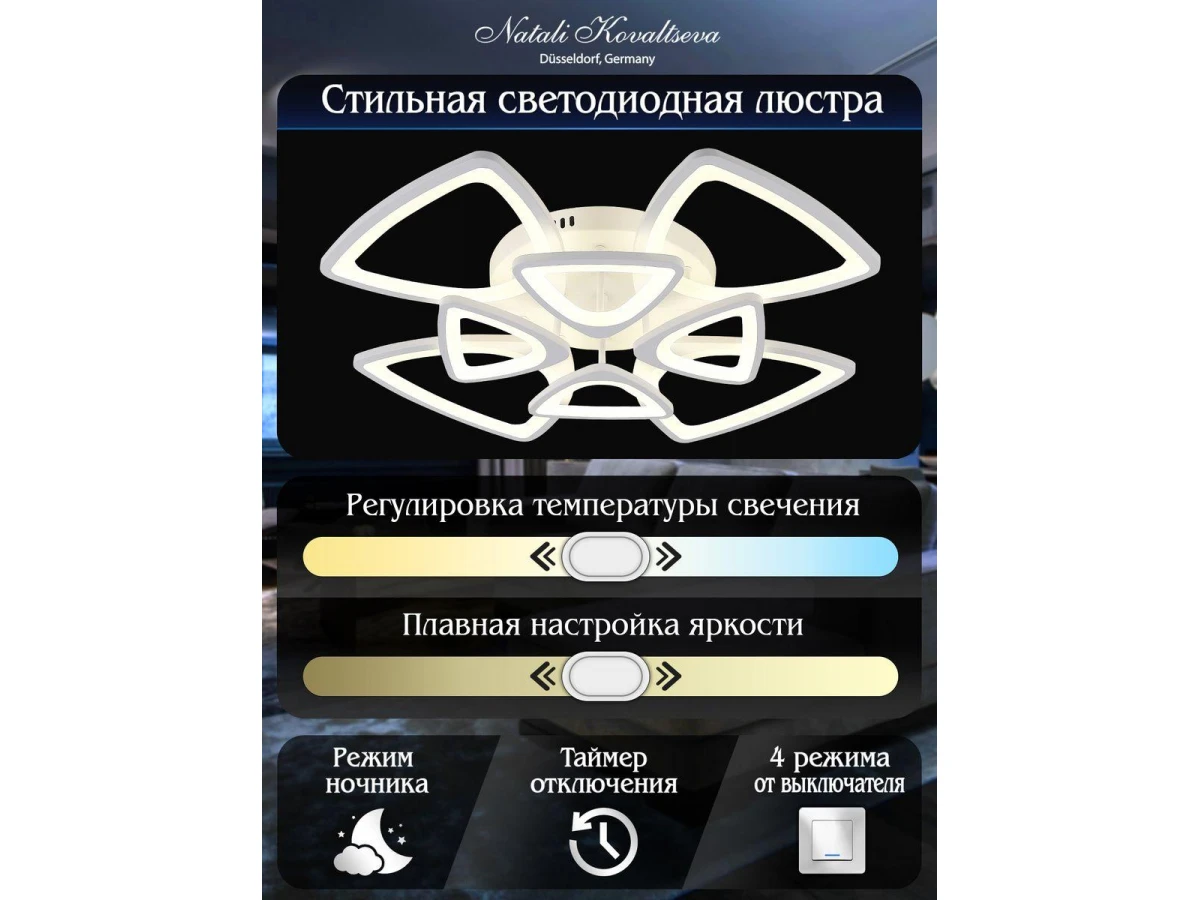 Стильная модель Innovation Style 83038 от немецкой компании Natali Kovaltseva относится к коллекции Innovation Style и отлично подойдет для установки на низкий потолок кафе и ресторанов, оформленных в стиле хай-тек. Потолочная светодиодная люстра Natali Kovaltseva Innovation Style 83038 с треугольными плафонами осветит помещение площадью 30 кв. м. холодным светом. Осветительный элемент встроен в конструкцию и не требует приобретения дополнительных лампочек. Прибор произведен с использованием материалов: пластик, металл и акрил и может использоваться для натяжного потолка. В комплект поставки входит пульт дистанционного управления. Основным цветом товара является хромовый, серебристо-стальной и белый. Потолочная светодиодная люстра Innovation Style 83038 с диммером продается по цене 19744 руб. Торопитесь сделать заказ в интернет-магазине ВоронежСвет.