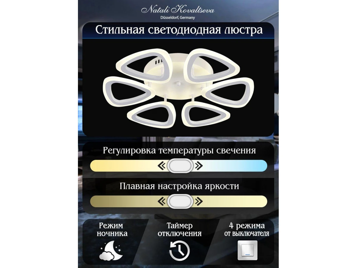 Уникальная модель Led Lamps 81127/6C от немецкой компании Natali Kovaltseva относится к коллекции LedLight и отлично подойдет для установки на низкий потолок в гостиной, оформленной в стиле хай-тек. Потолочная светодиодная люстра Natali Kovaltseva Led Lamps 81127/6C с треугольными плафонами осветит помещение площадью 25 кв. м. холодным светом. Осветительный элемент встроен в конструкцию и не требует приобретения дополнительных лампочек. Прибор произведен с использованием материалов: пластик, металл и акрил и может использоваться для натяжного потолка. В комплект поставки входит пульт дистанционного управления. Основным цветом товара является белый. Торопитесь сделать заказ в интернет-магазине ВоронежСвет.