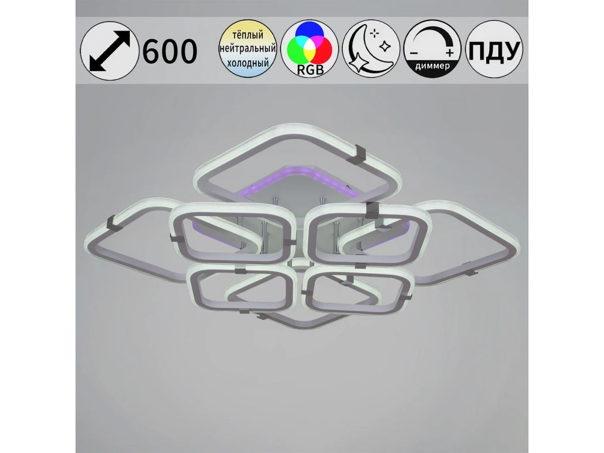 Изысканная модель 06321-3.3-4+4A WH+CR (RGB) от итальянской компании Reluce и отлично подойдет для установки на низкий потолок в гостиной, оформленной в современном стиле. Потолочная светодиодная люстра Reluce 06321-3.3-4+4A WH+CR (RGB) с квадратными плафонами осветит помещение площадью 40 кв. м. холодным светом. Осветительный элемент встроен в конструкцию и не требует приобретения дополнительных лампочек. Прибор произведен с использованием материалов: пластик и металл и акрил и может использоваться для натяжного потолка. В комплект поставки входит пульт дистанционного управления. Основным цветом товара является белый. Потолочная светодиодная люстра 06321-3.3-4+4A WH+CR (RGB) с диммером продается по цене 15380 руб. Торопитесь сделать заказ в интернет-магазине ВоронежСвет.