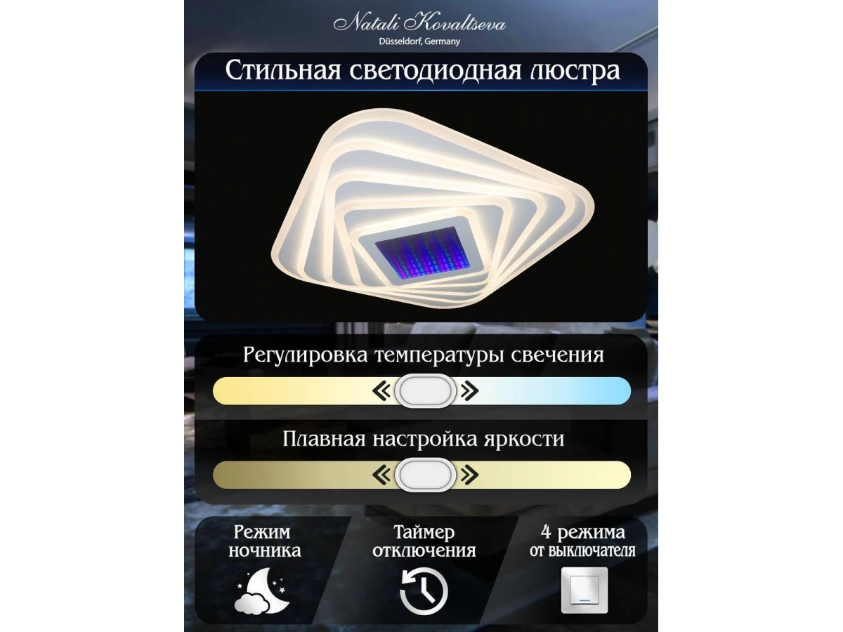 Необыкновенная модель 81033/3C от немецкой компании Natali Kovaltseva относится к коллекции Led и отлично подойдет для установки на низкий потолок кухни, оформленной в современном стиле. Потолочный светодиодный светильник Natali Kovaltseva Led 81033/3C с квадратными плафонами осветит помещение площадью 25 кв. м. холодным светом. Осветительный элемент встроен в конструкцию и не требует приобретения дополнительных лампочек. Прибор произведен с использованием материалов: пластик, металл и акрил и может использоваться для натяжного потолка. В комплект поставки входит пульт дистанционного управления. Основным цветом товара является белый. Торопитесь сделать заказ в интернет-магазине ВоронежСвет.
