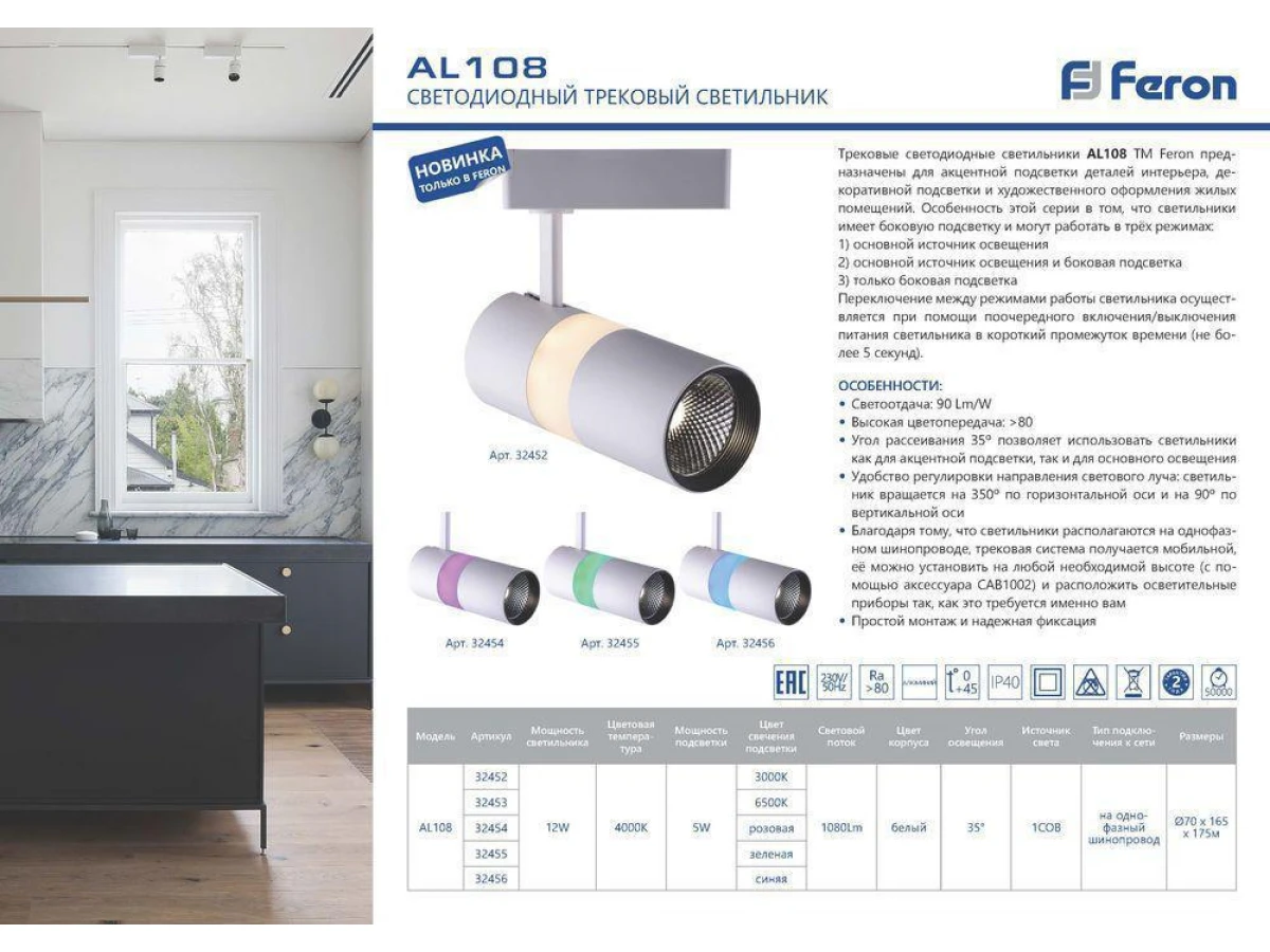 Светильник трековый светодиодный на шинопровод, однофазный (ДПО) FERON AL108, 12+5W, 4000К (белый), + подсветка синяя, 230V, 1080Lm, угол освещения 35°, цвет белый, корпус алюминий, рассеиватель поликарбонат, вращение →350°/↓90°, 165*70*175 мм