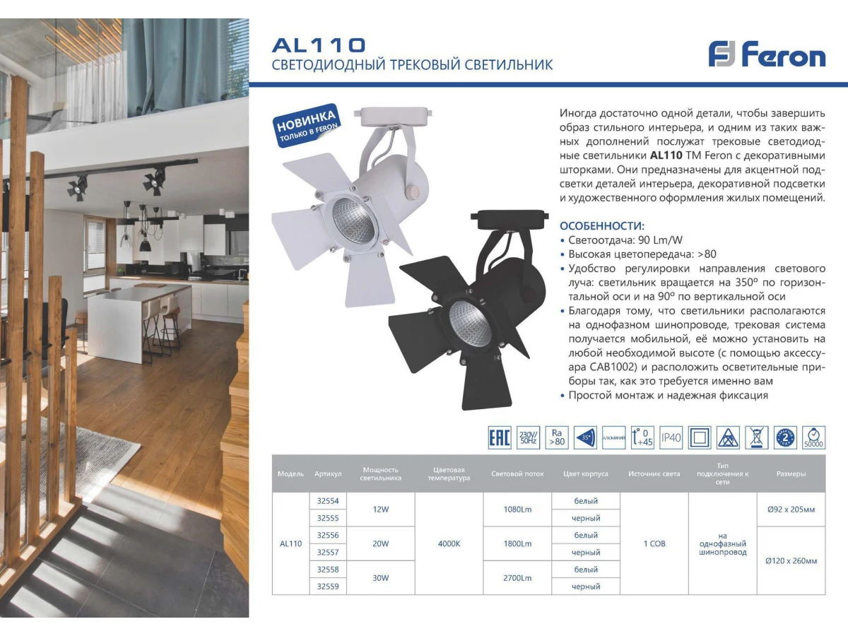 Светильник трековый светодиодный на шинопровод, однофазный (ДПО) FERON AL110, 30W, 4000К (белый), 230V, 2700Lm, угол освещения 35°, цвет черный, корпус алюминий, рассеиватель поликарбонат, вращение →350°/↓90°, 120*120*260 мм