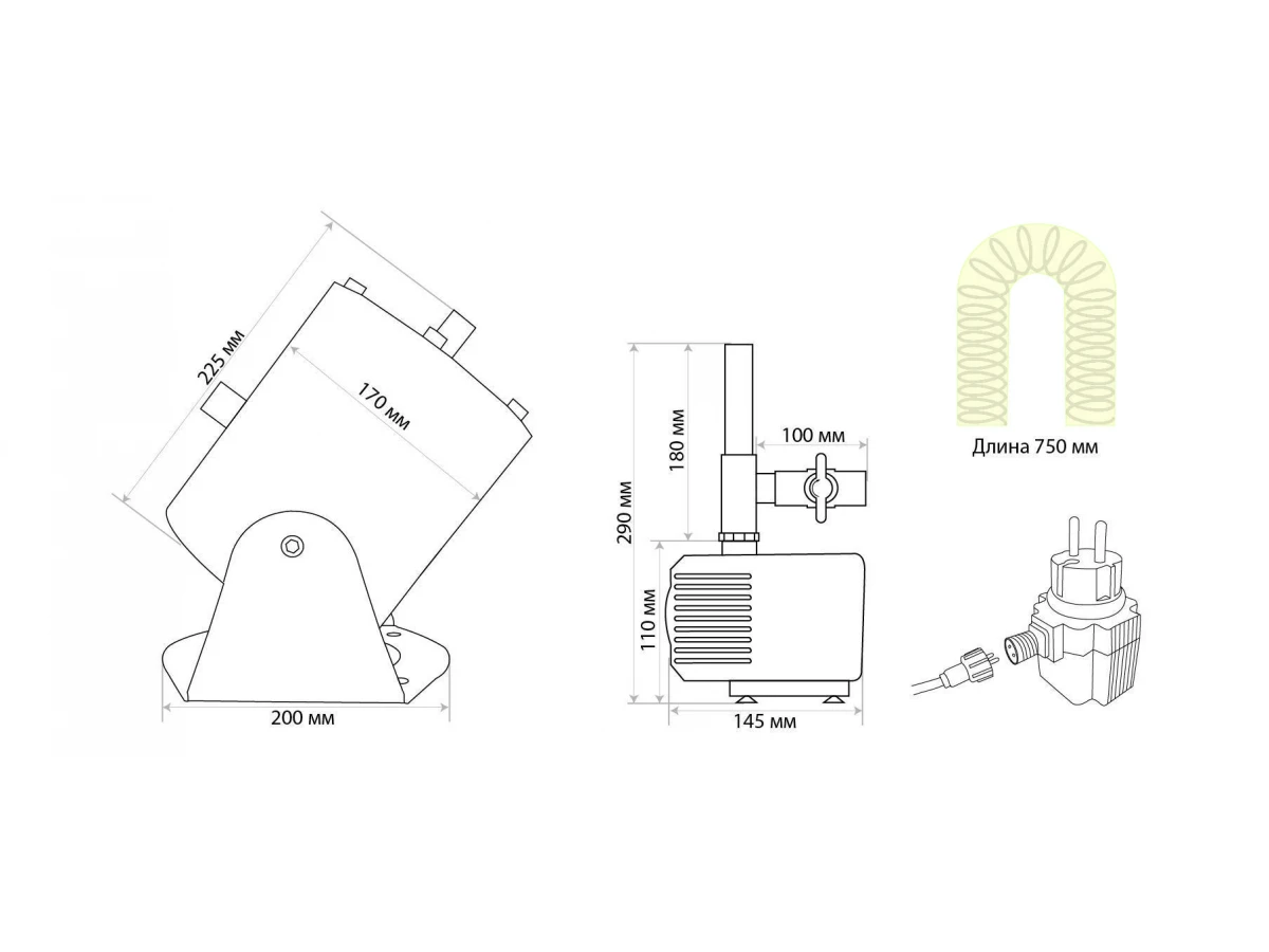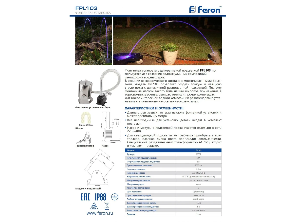 Насос фонтанный с подсветкой FPL103, размер 195*168*273мм, длина провода насоса 1,5 м, материал корпуса - сталь. Допустимая температура воды +3..+40, глубина погружения не более 2 м. Производительность насоса 3000л/час, напряжение насоса 220-240В, мощность насоса 50 Вт, класс защиты от поражения электрическим током - 3, степень пылевлагозащиты насоса IP68. В комплекте: Насос, трансформатор, гофротруба, вентиль, переходник