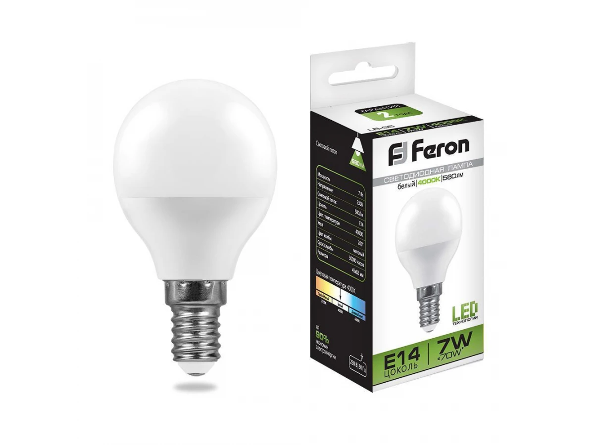 Лампа светодиодная FERON LB-95, G45 (шар малый), 7W 230V E14 4000К (белый), рассеиватель матовый белый, 580Lm, угол рассеивания 220°, корпус пластик, 82*45мм