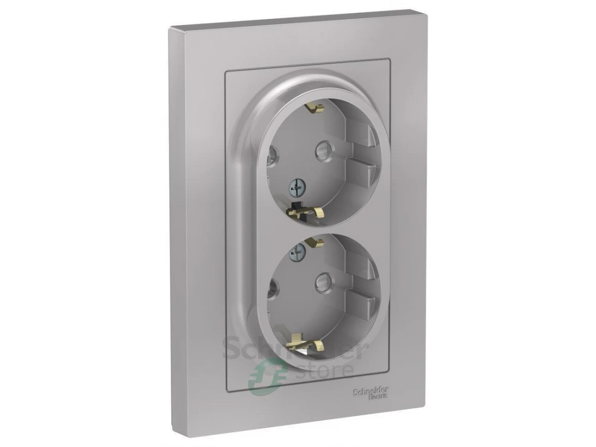 Розетка двойная Schneider Electric AtlasDesign (в сборе, цвет алюминий) с заземлением и шторками подходит для сетей 250 В, на ток 16 А.