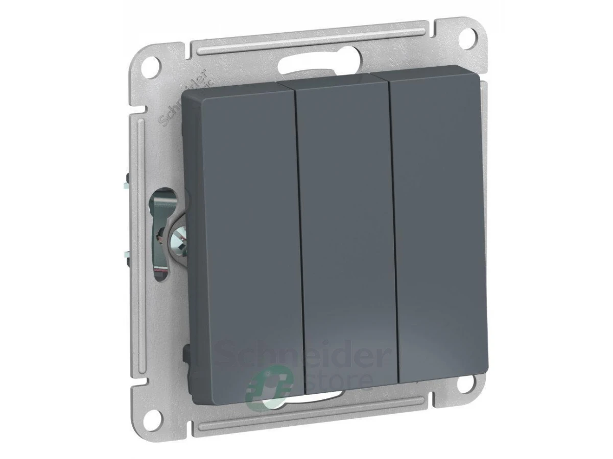 Механизм Schneider Electric AtlasDesign (цвет грифель) выключателя 3-клавишного подходит для сетей 250 В, на ток 10 А.