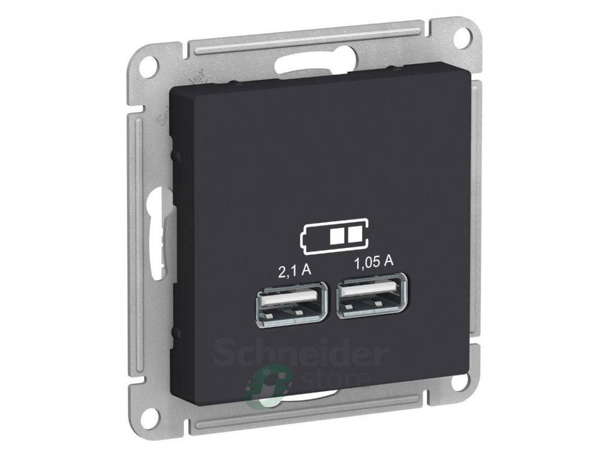 Механизм Schneider Electric AtlasDesign (цвет карбон) розетки для зарядки с двумя разъёмами USB с выходными напряжением 5 В постоянного тока и выходами с номинальным током по 2,1 А.
